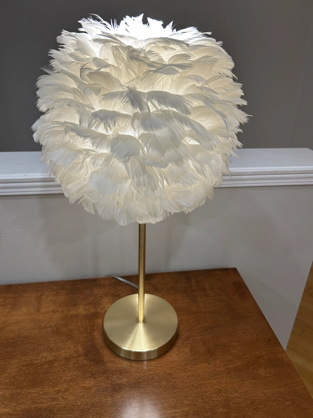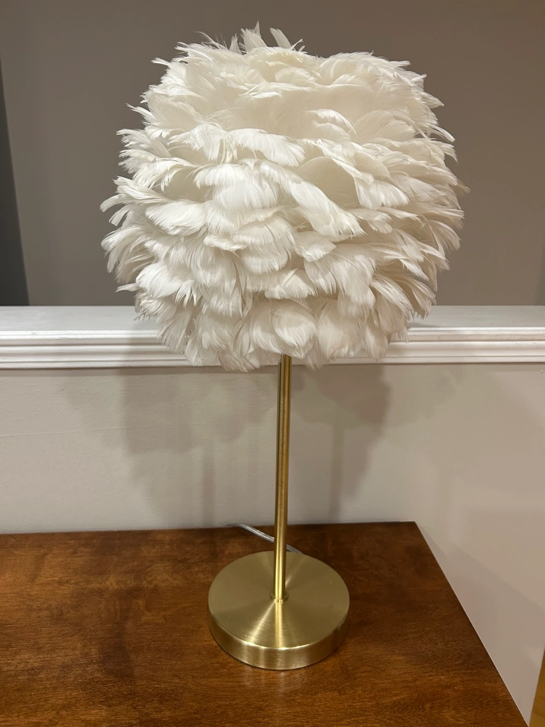 Table lamp with a white feather shade. Features a gold base and stem. Equipped with a USB port. Perfect for a nightstand or desk.