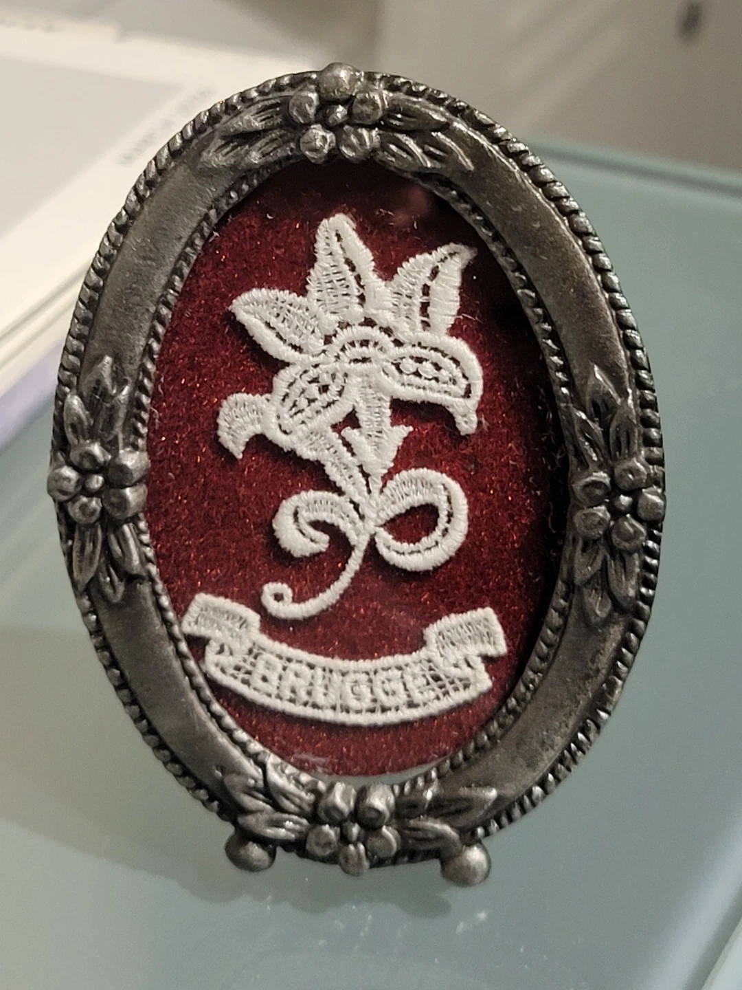 Adorn your space with this exquisite vintage Brugge lace floral picture frame, showcasing delicate craftsmanship. This unique piece features an ornate silver-tone oval frame with a burgundy velvet backing, highlighting a beautifully detailed white lace floral design. It's a charming addition to any collection, bringing a touch of old-world elegance to your home. Please note that this is a used item.