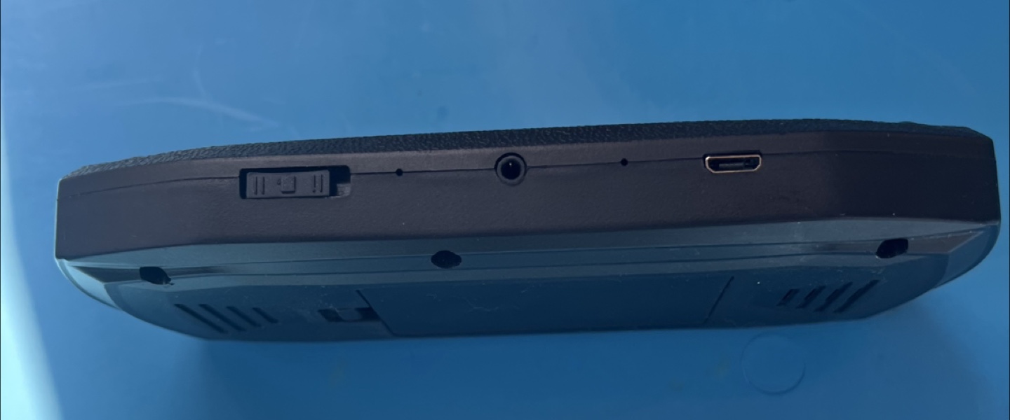 A portable gaming device in black. Features a screen and multiple buttons.