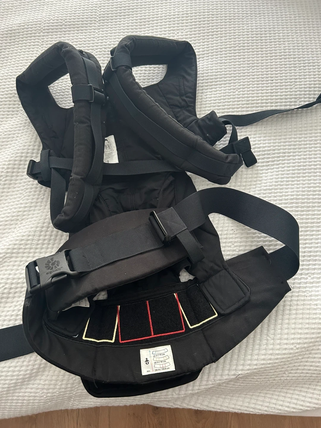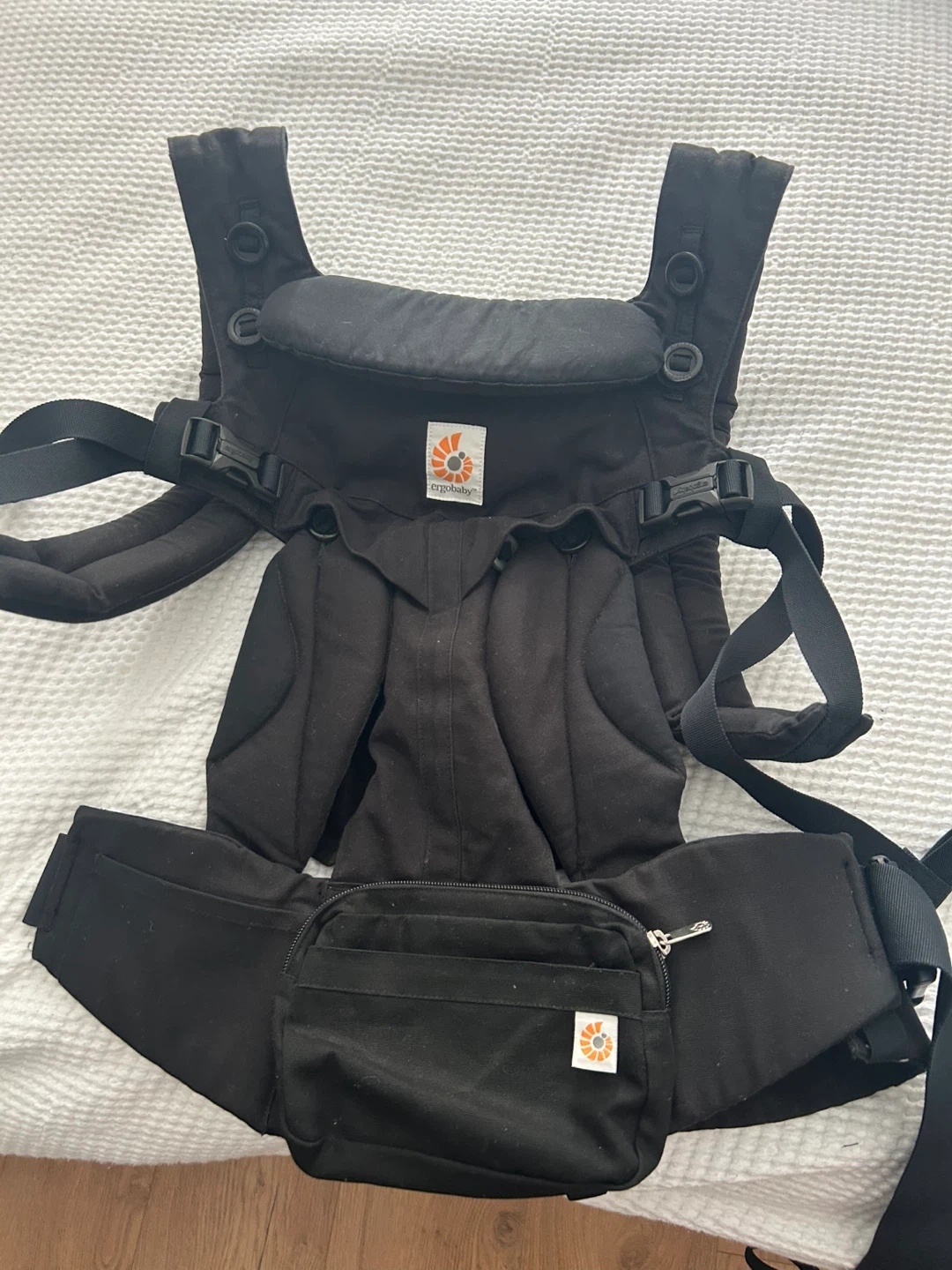 This is an Ergobaby Omni 360 baby carrier in pure black. It's designed for hands-free carrying. The carrier offers multiple carrying positions and can hold up to 45 lbs. Only used a few times
