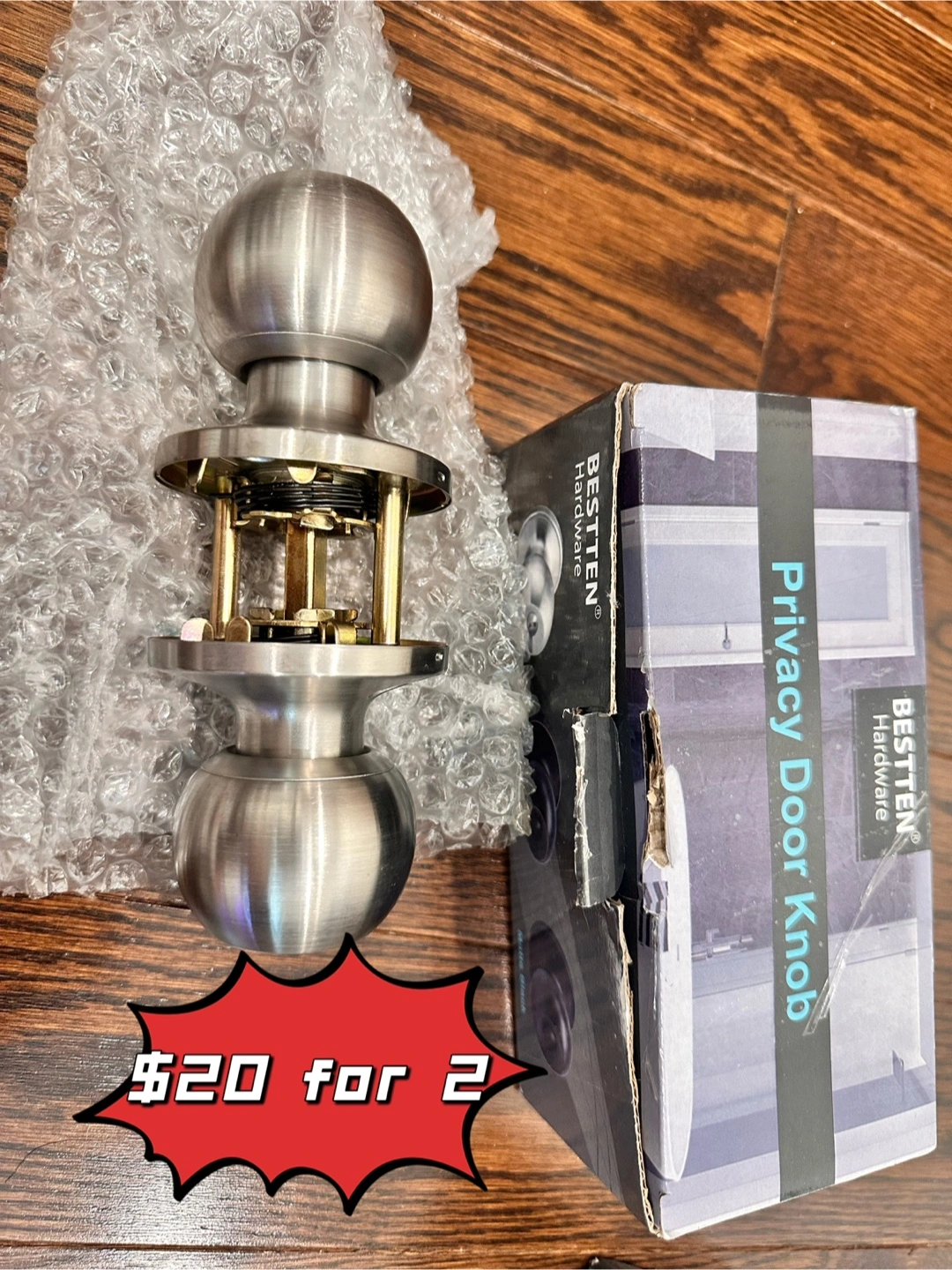 Silver door knobs. Includes the box and bubble wrap packaging. These knobs can add a touch of privacy to any door, allowing you to create a space for quiet reflection.