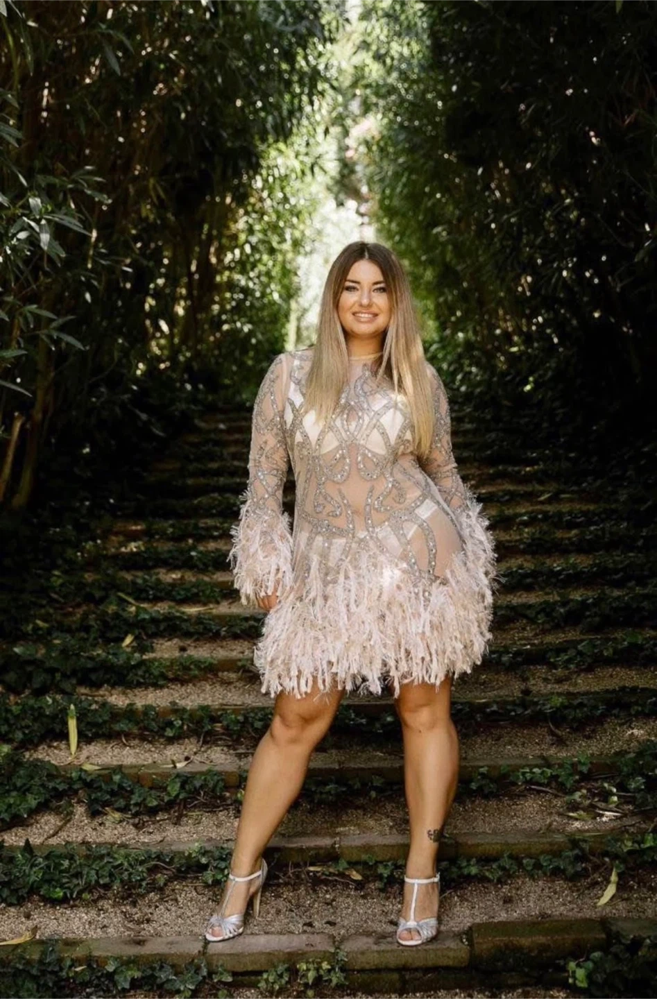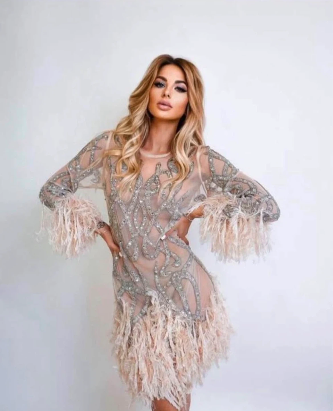 Luxury Beaded Feather Dress – Nude & Silver Party Outfit