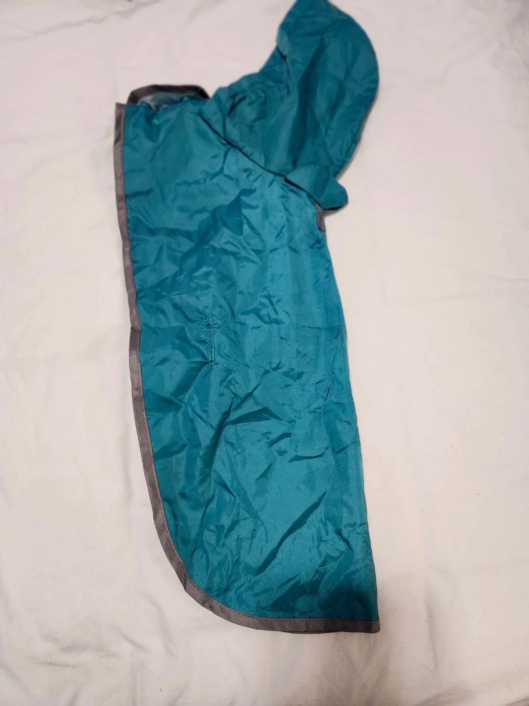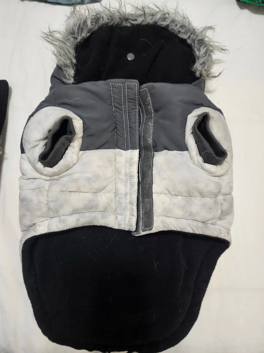 A cozy quilted winter coat with a faux fur hood and a teal raincoat. Both have openings for a leash. Keep your furry friend warm and dry!