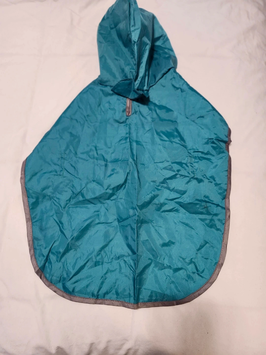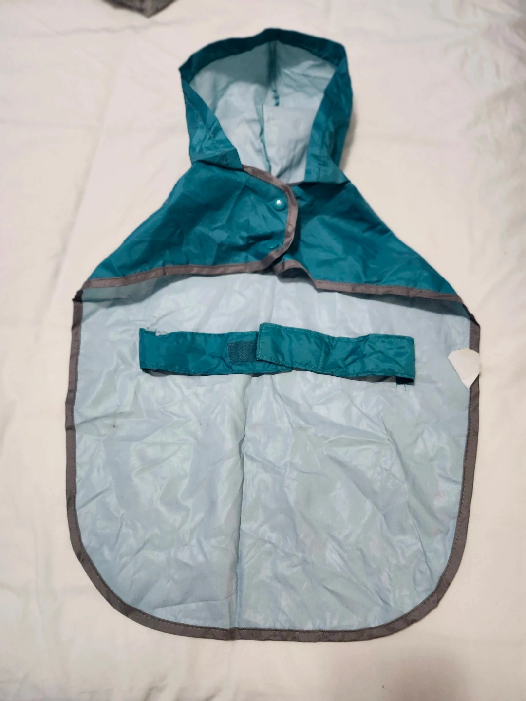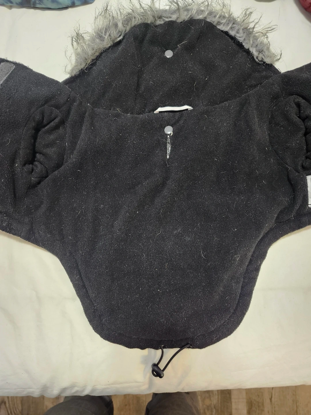 A cozy quilted winter coat with a faux fur hood and a teal raincoat. Both have openings for a leash. Keep your furry friend warm and dry!
