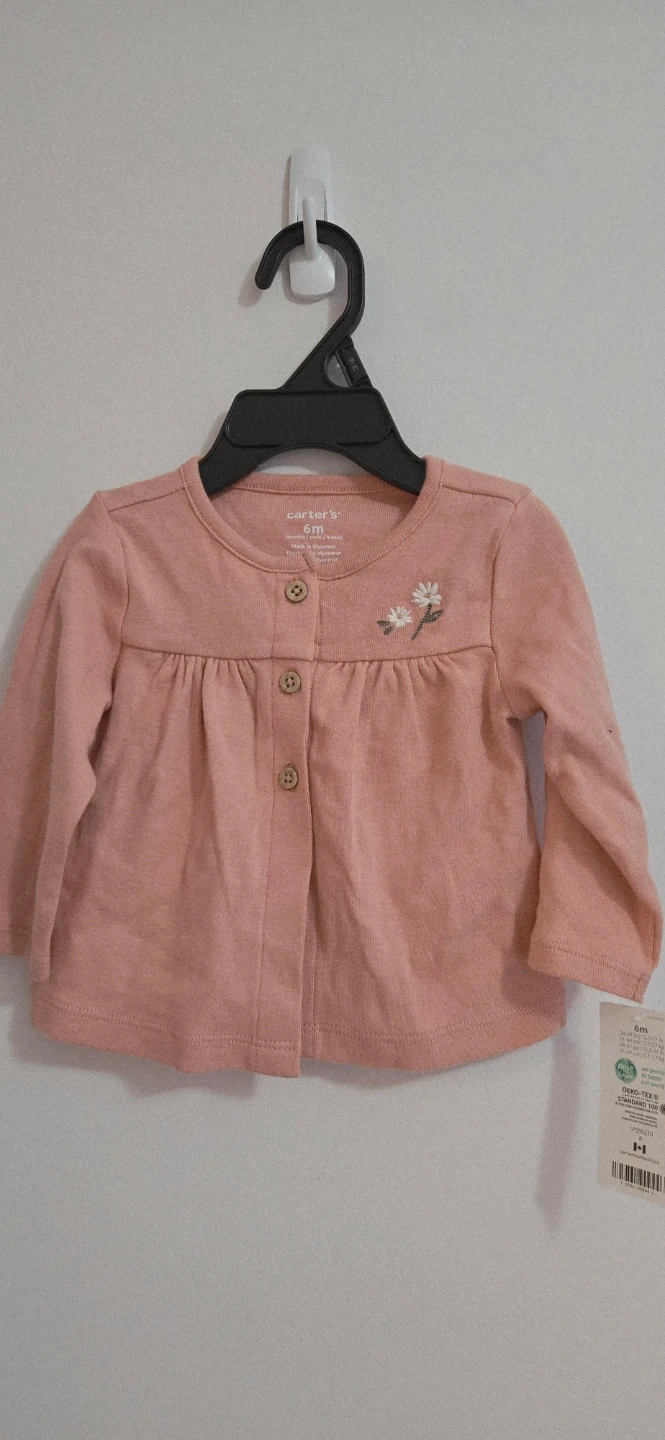 New w tags!Carters pink cardigan for baby girls. Size 6 months, fits 12.5-17 lb or 5.7-7.7 kg. Made from soft fabric.