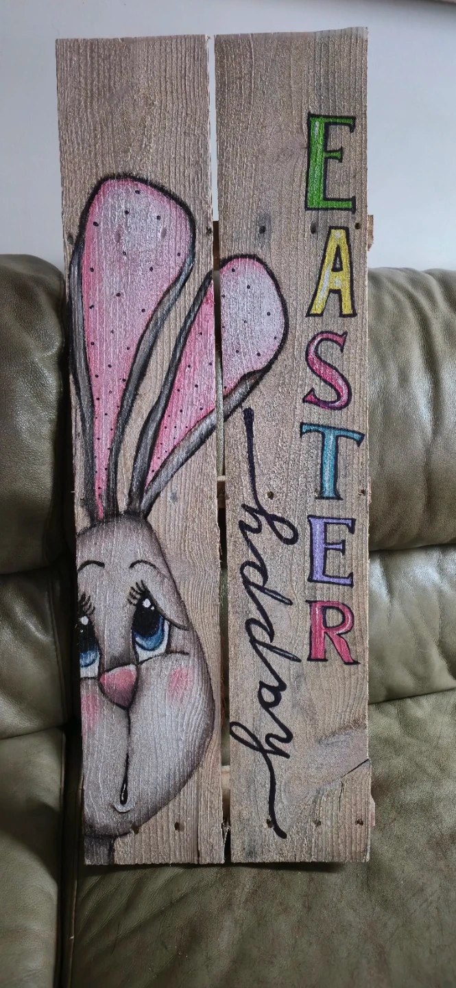 Cute hand-painted wooden signs perfect for Easter and spring decor. One sign features a bunny's tail and 'Hello SPRING,' while the other has a bunny face and 'happy EASTER.' Add a festive touch to your home! $20-40