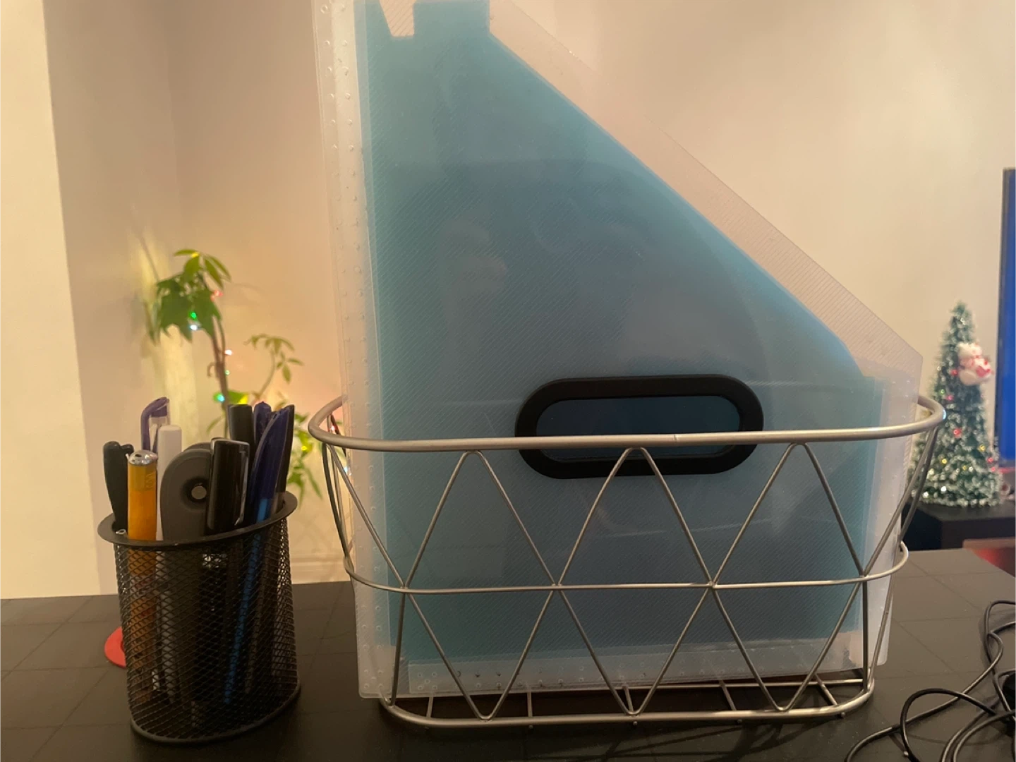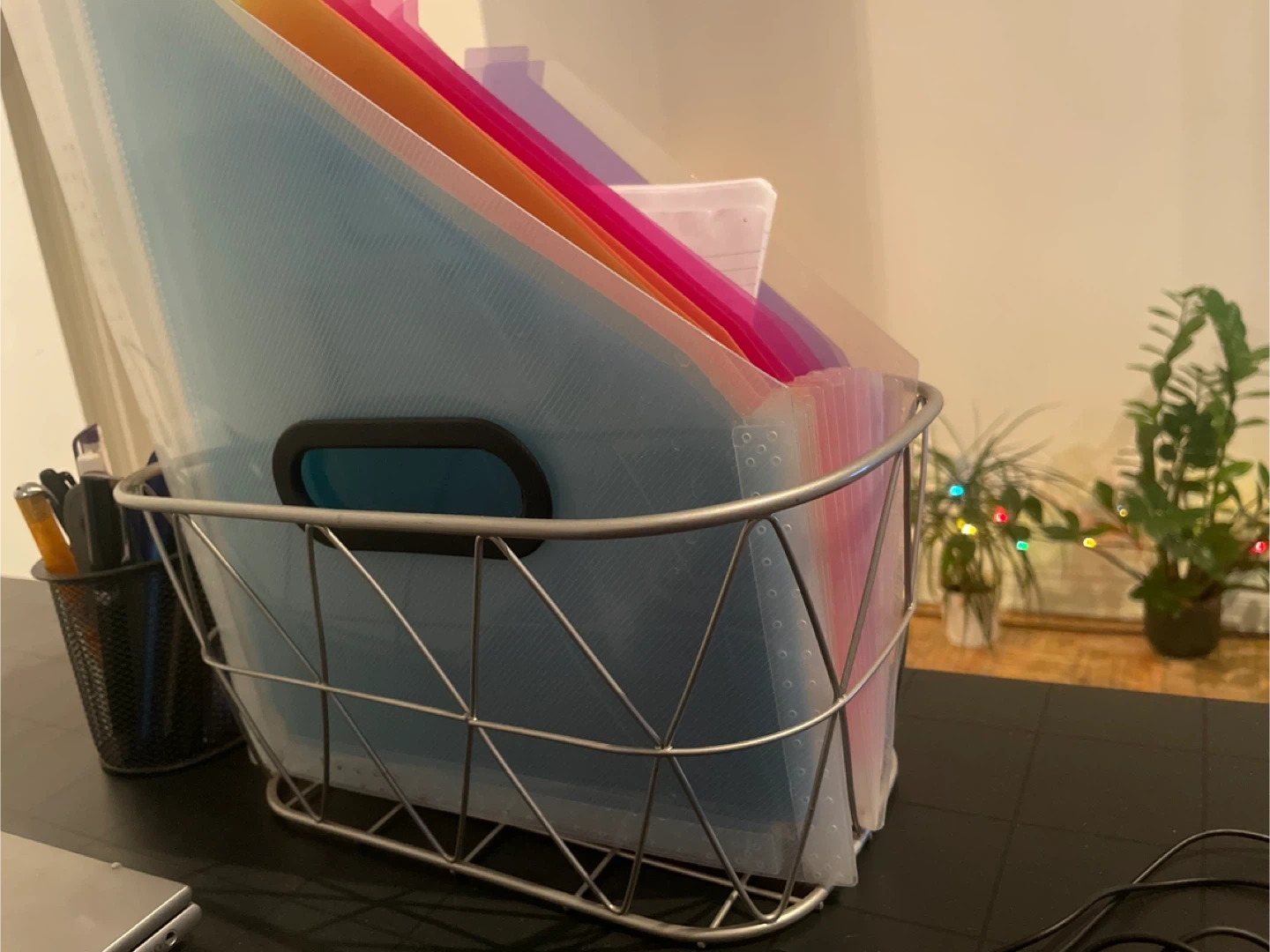 Selling a desk organizer set, including a black metal mesh pen holder and a metal basket filled with colourful file folders.