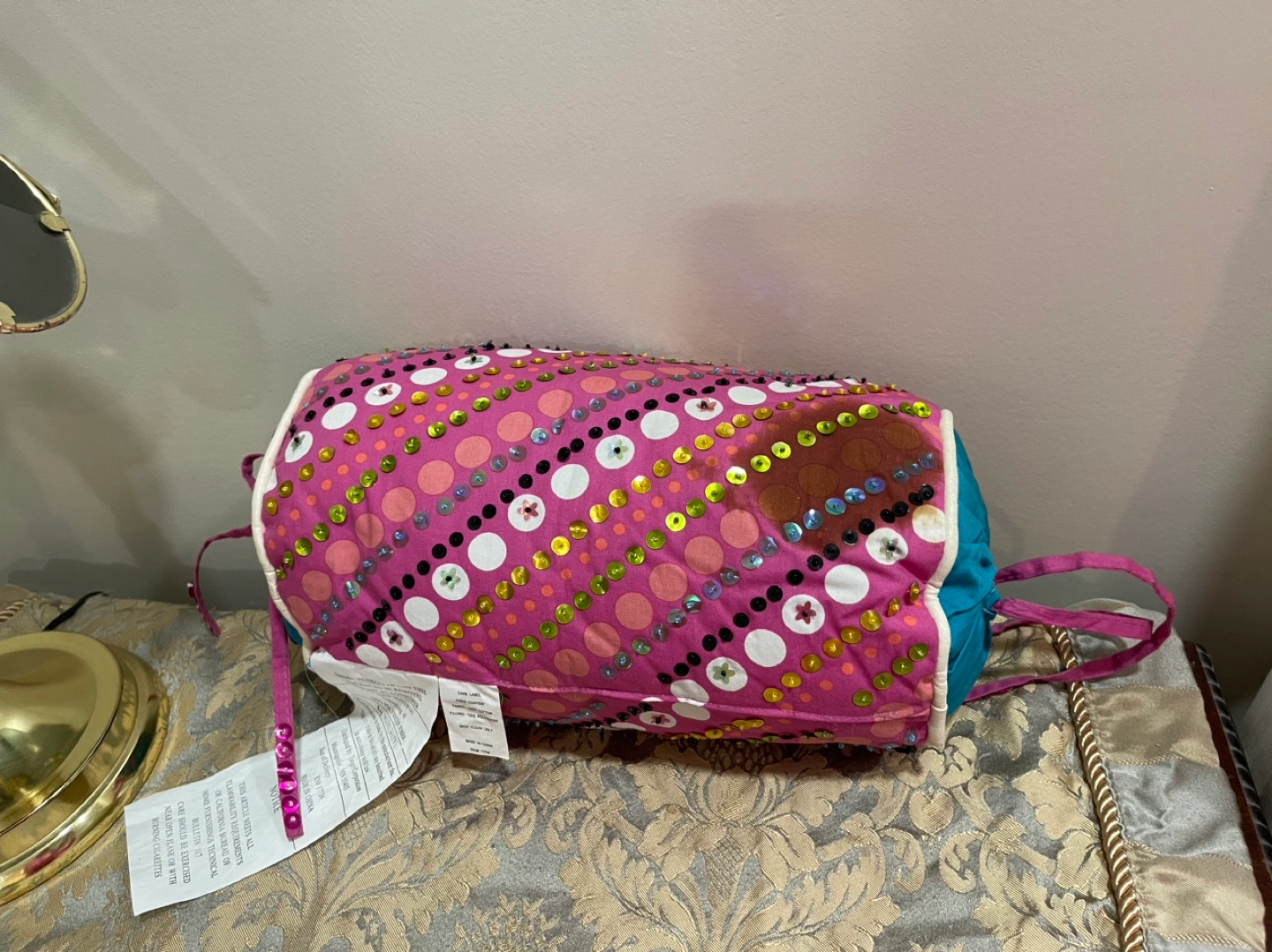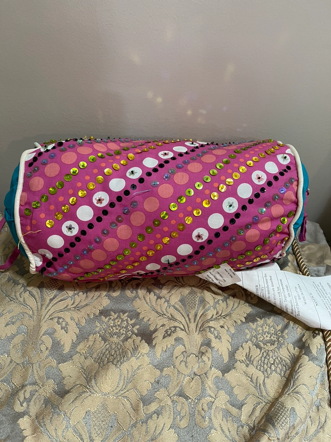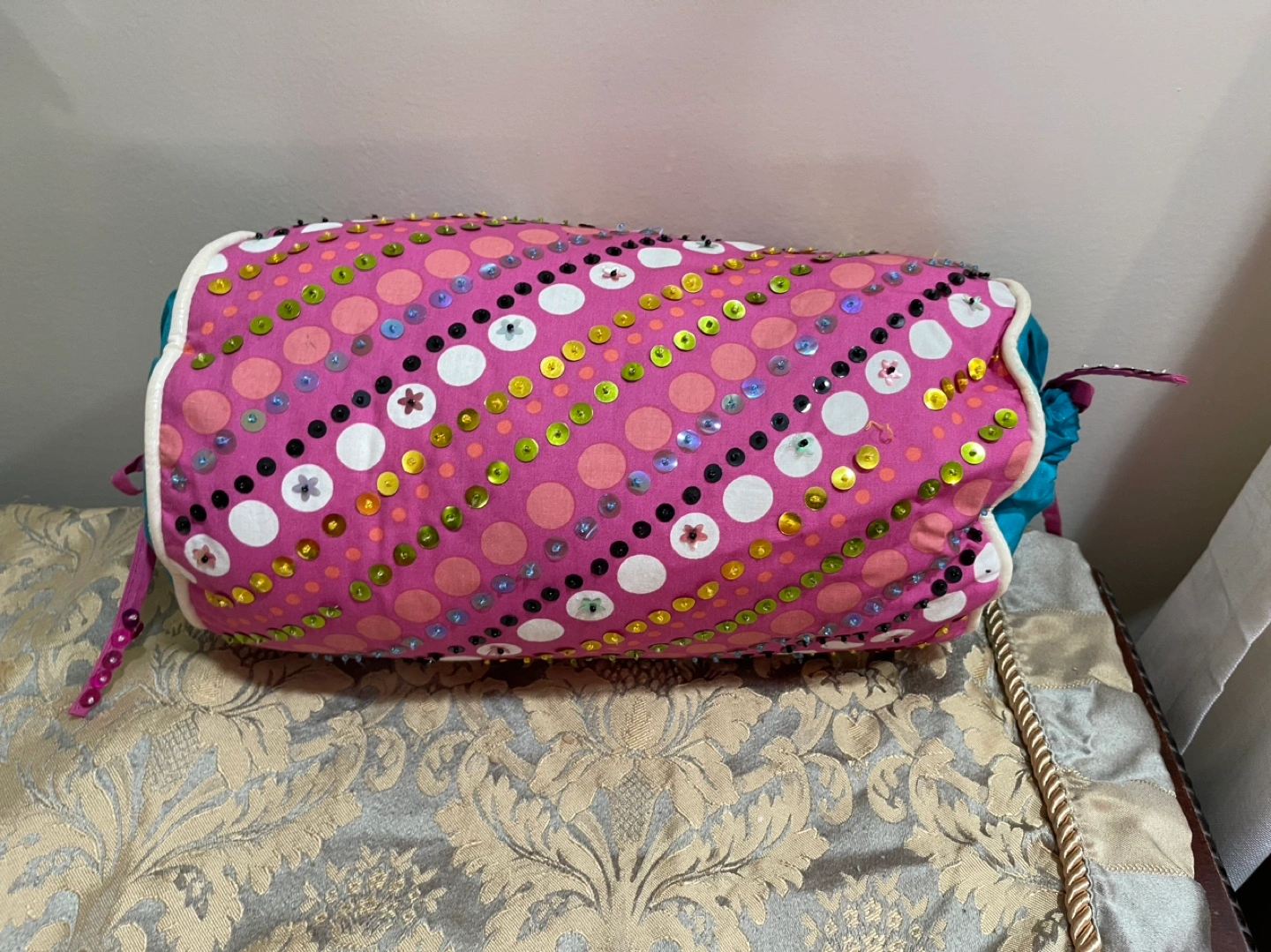 Pink cylindrical pillow. Teal fabric lining. Embroidered with sequins and beads. Drawstring closure. Minor discoloration. Original price $50