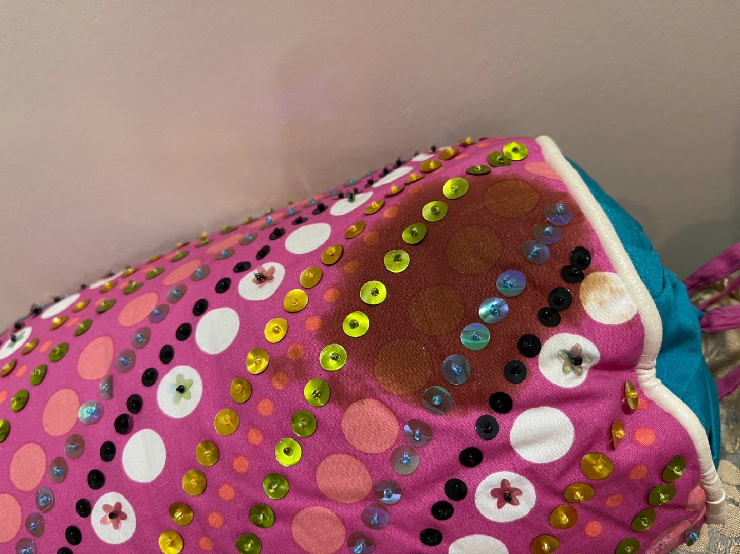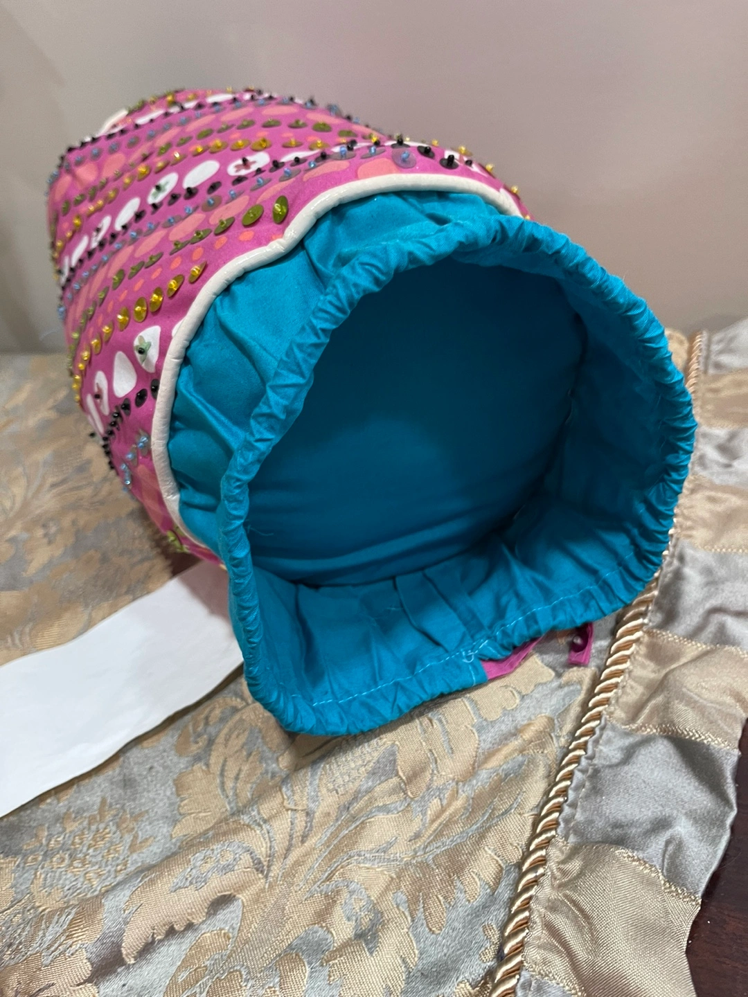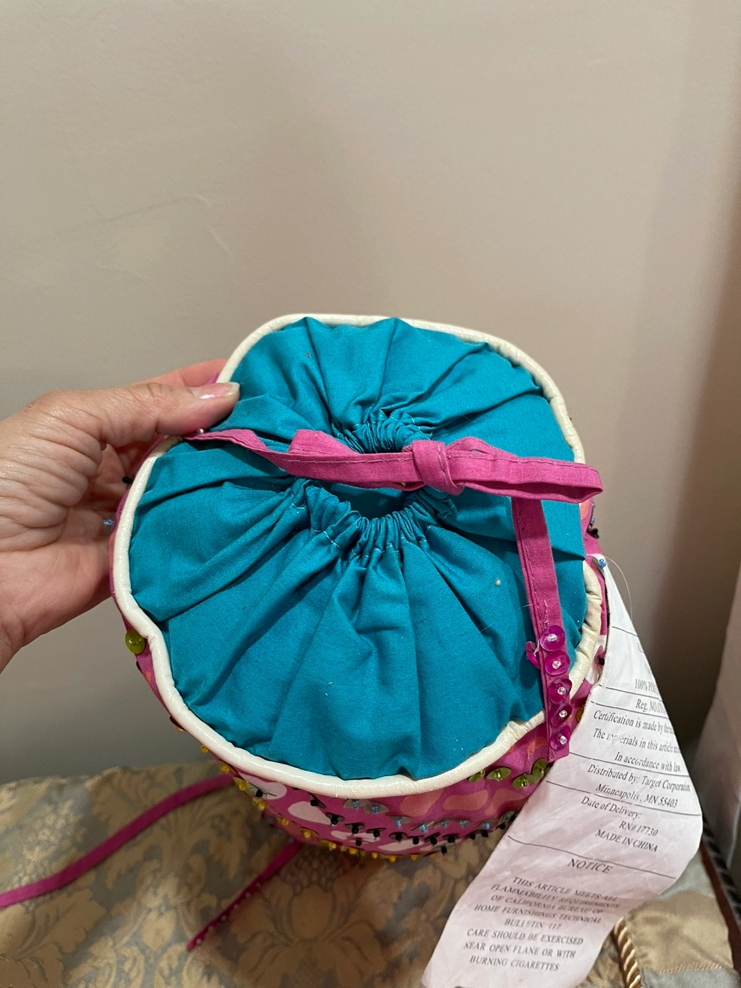 Pink cylindrical pillow. Teal fabric lining. Embroidered with sequins and beads. Drawstring closure. Minor discoloration. Original price $50