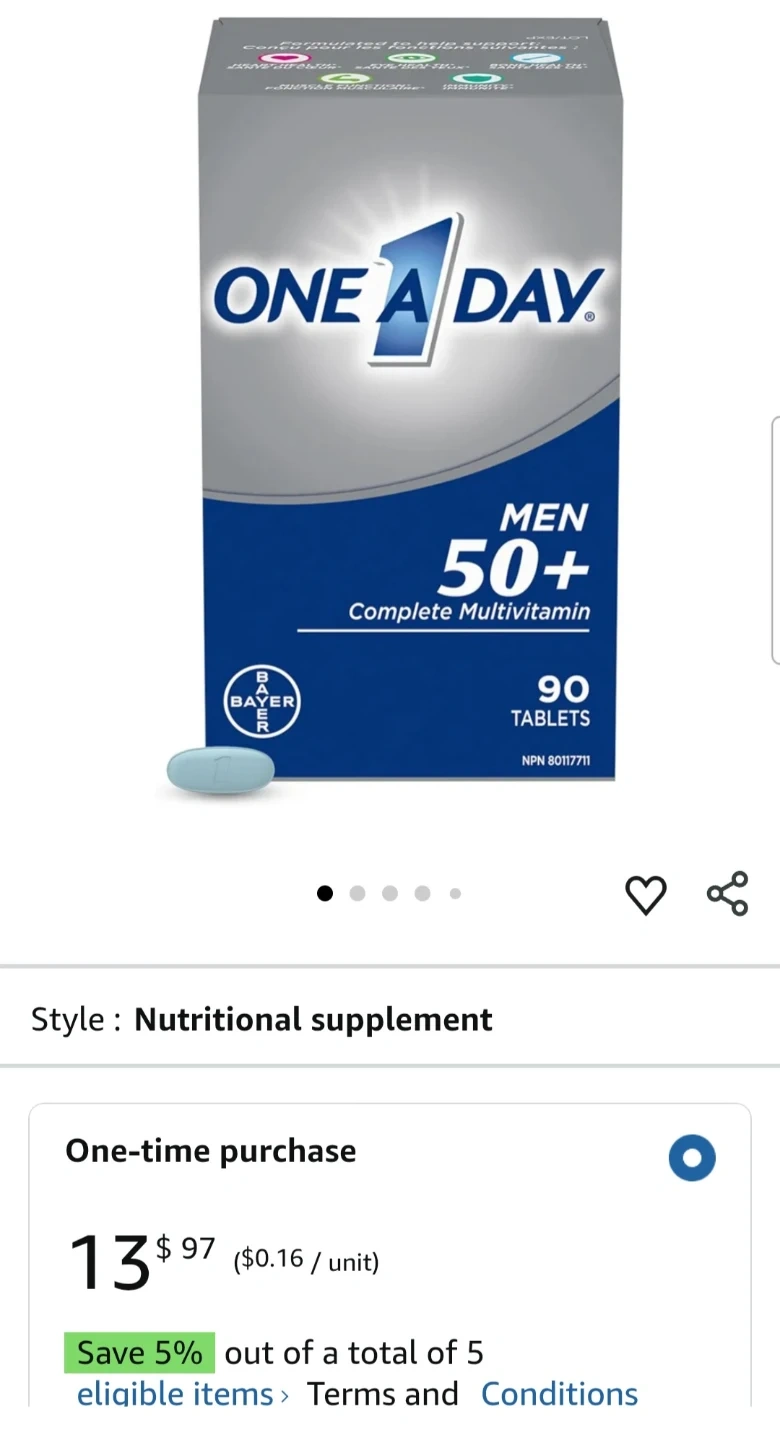 One A Day Men 50+ Complete Multivitamin. It's formulated to support 6 key benefits: heart health, eye health, bone health, muscle function, immune health, and energy metabolism. This bottle contains 90 tablets.