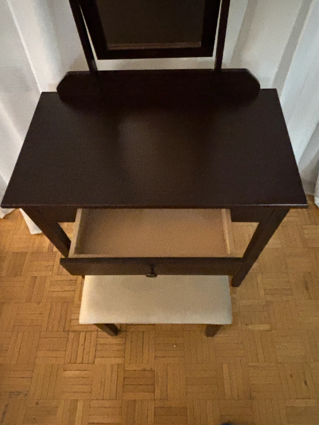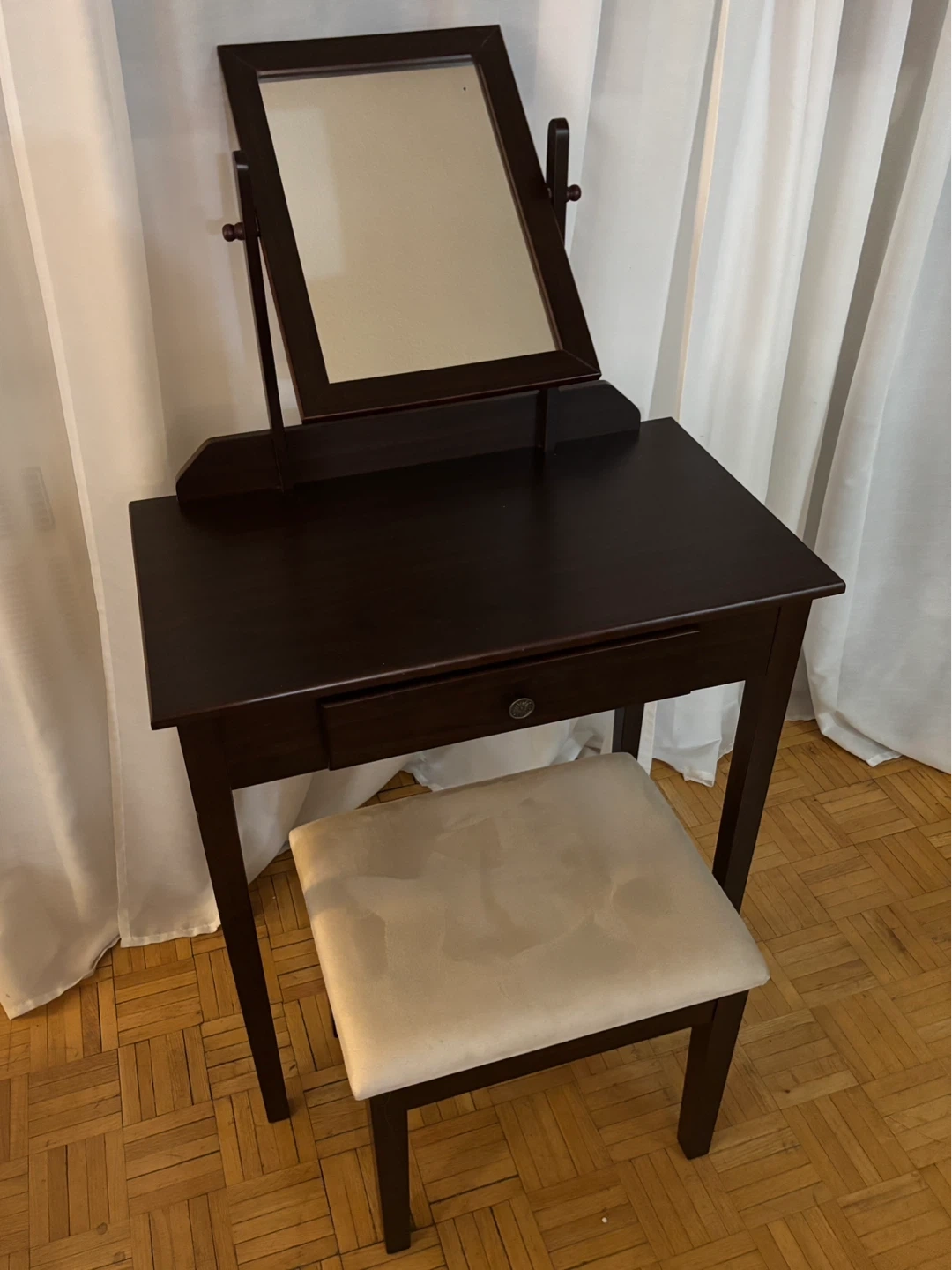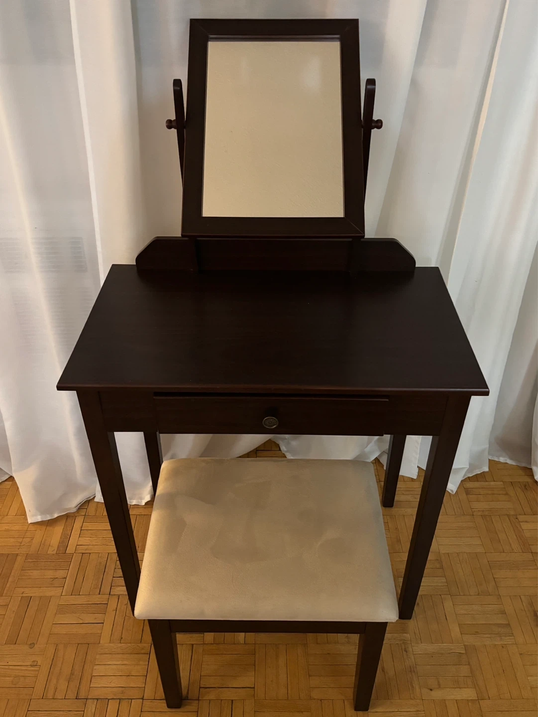 Dark wood vanity table comes with a matching stool and an adjustable mirror.