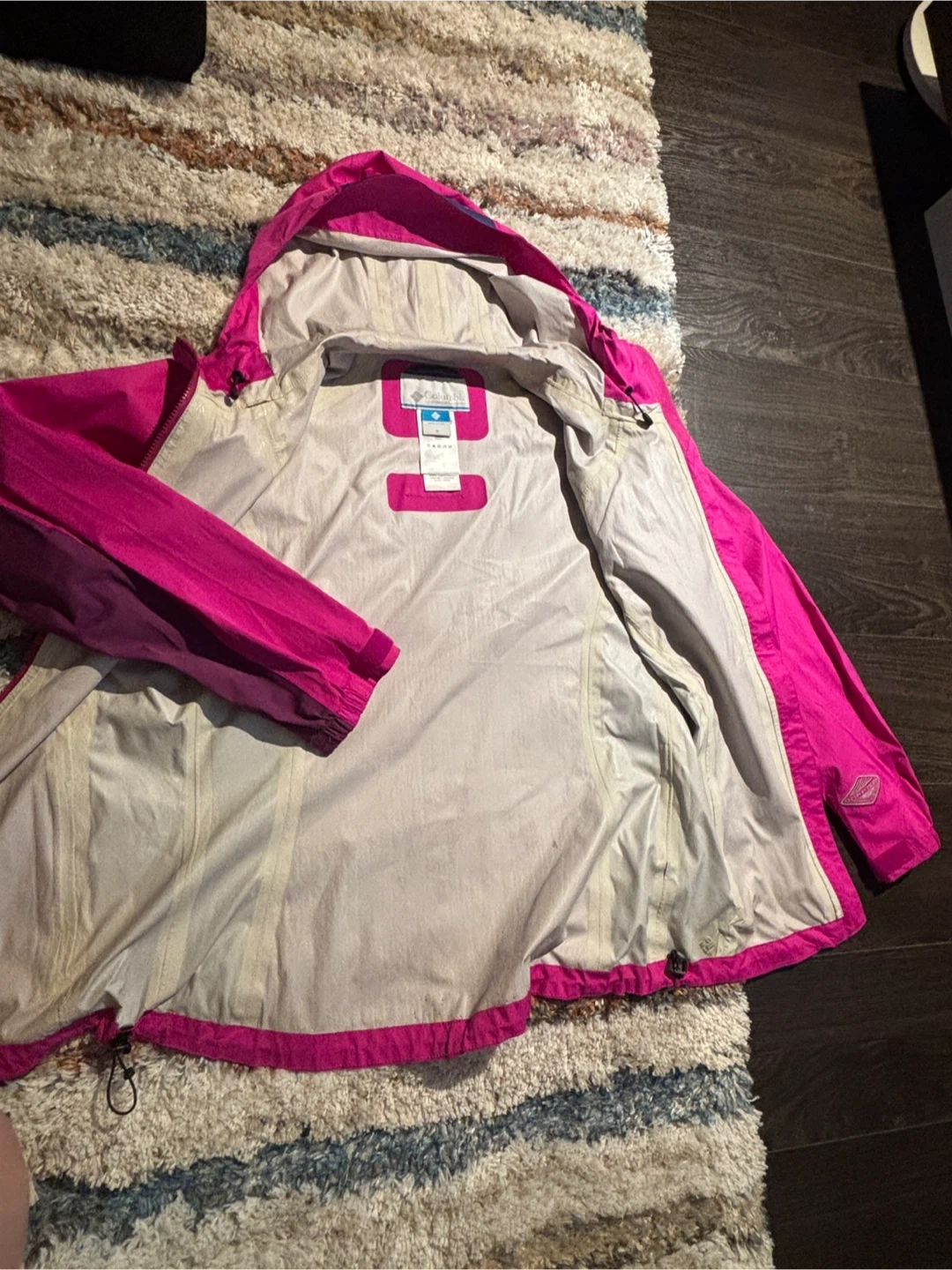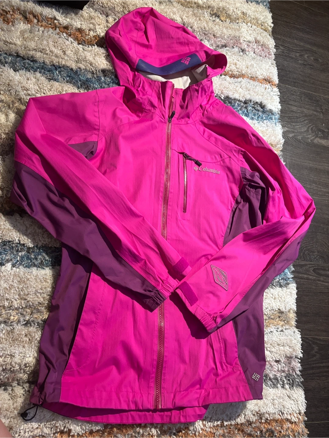 Selling a Columbia rain jacket in pink and purple. It's a size medium and in great condition! Perfect for those rainy days or outdoor activities. It's lightweight and easy to pack away when the sun comes out