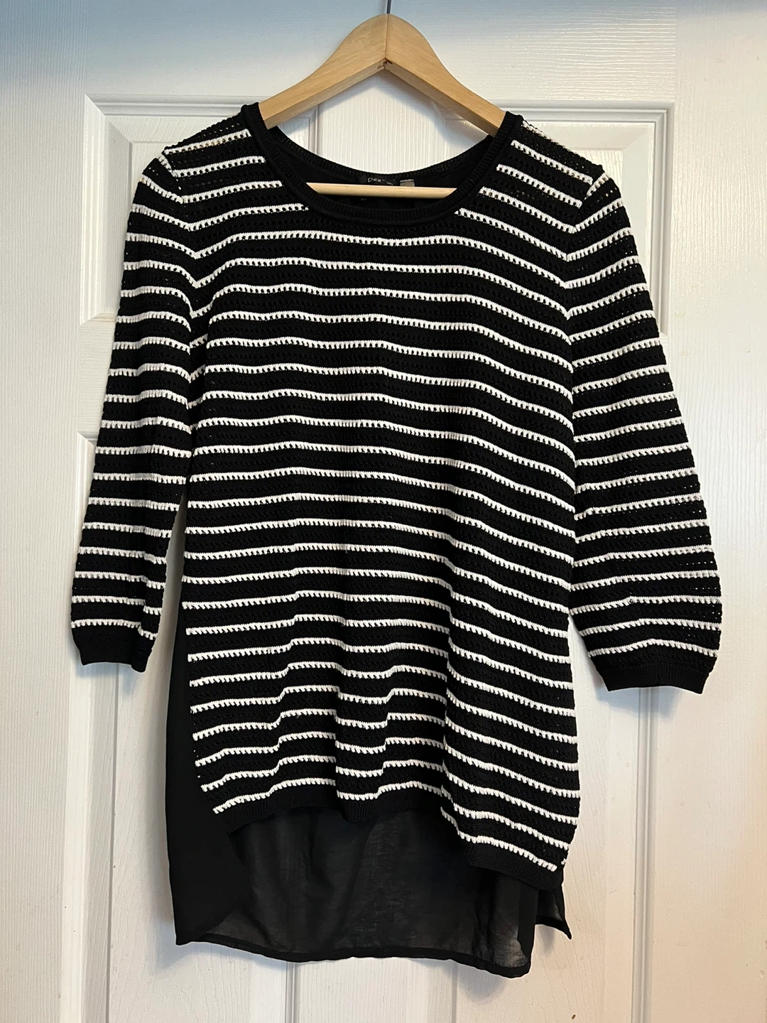 Striped mock neck sweater with long sleeves. Features a vertical stripe pattern in grey and white. It's a cozy knit perfect for cooler weather. Medium- Large. $18 for all 3