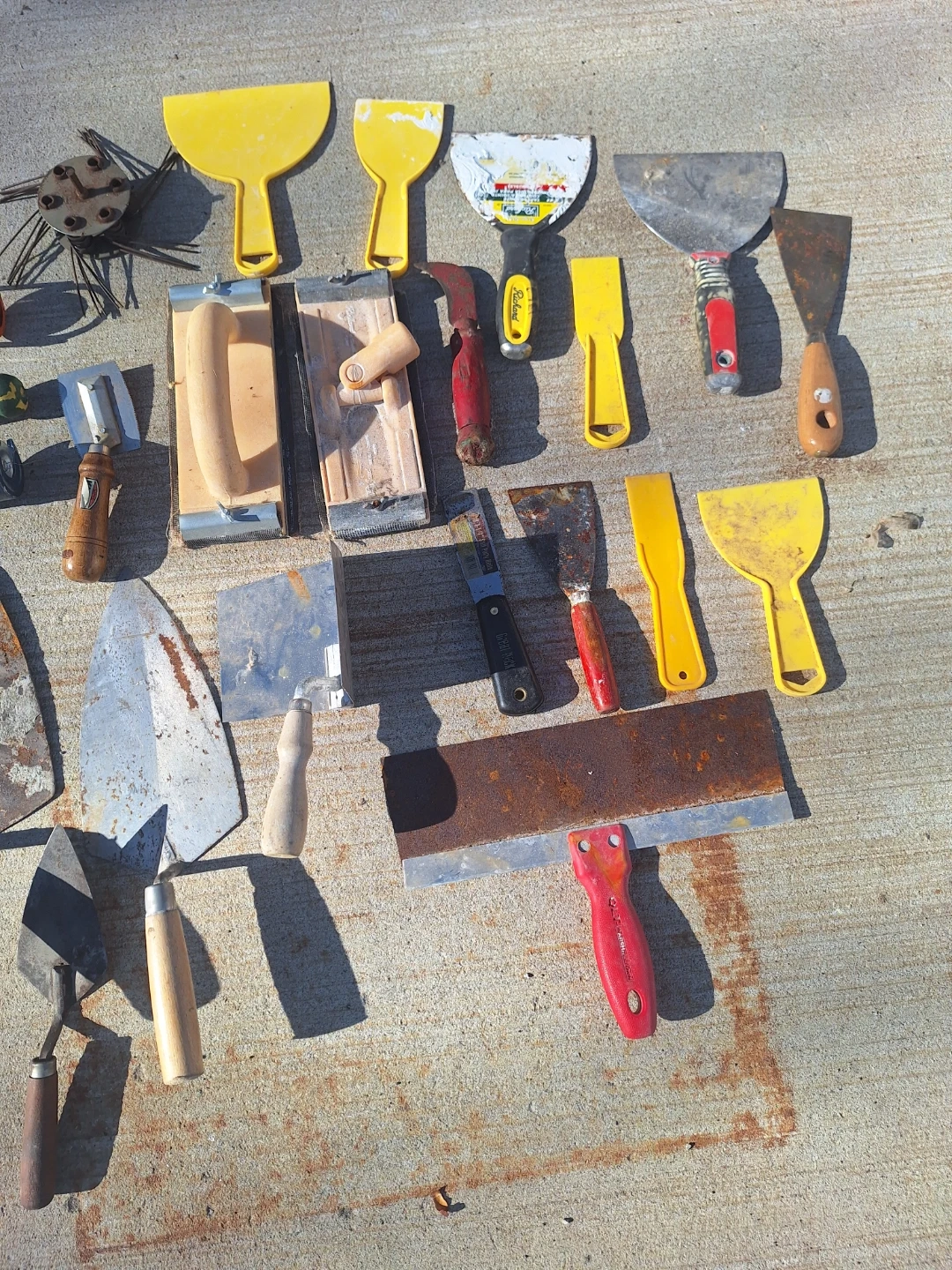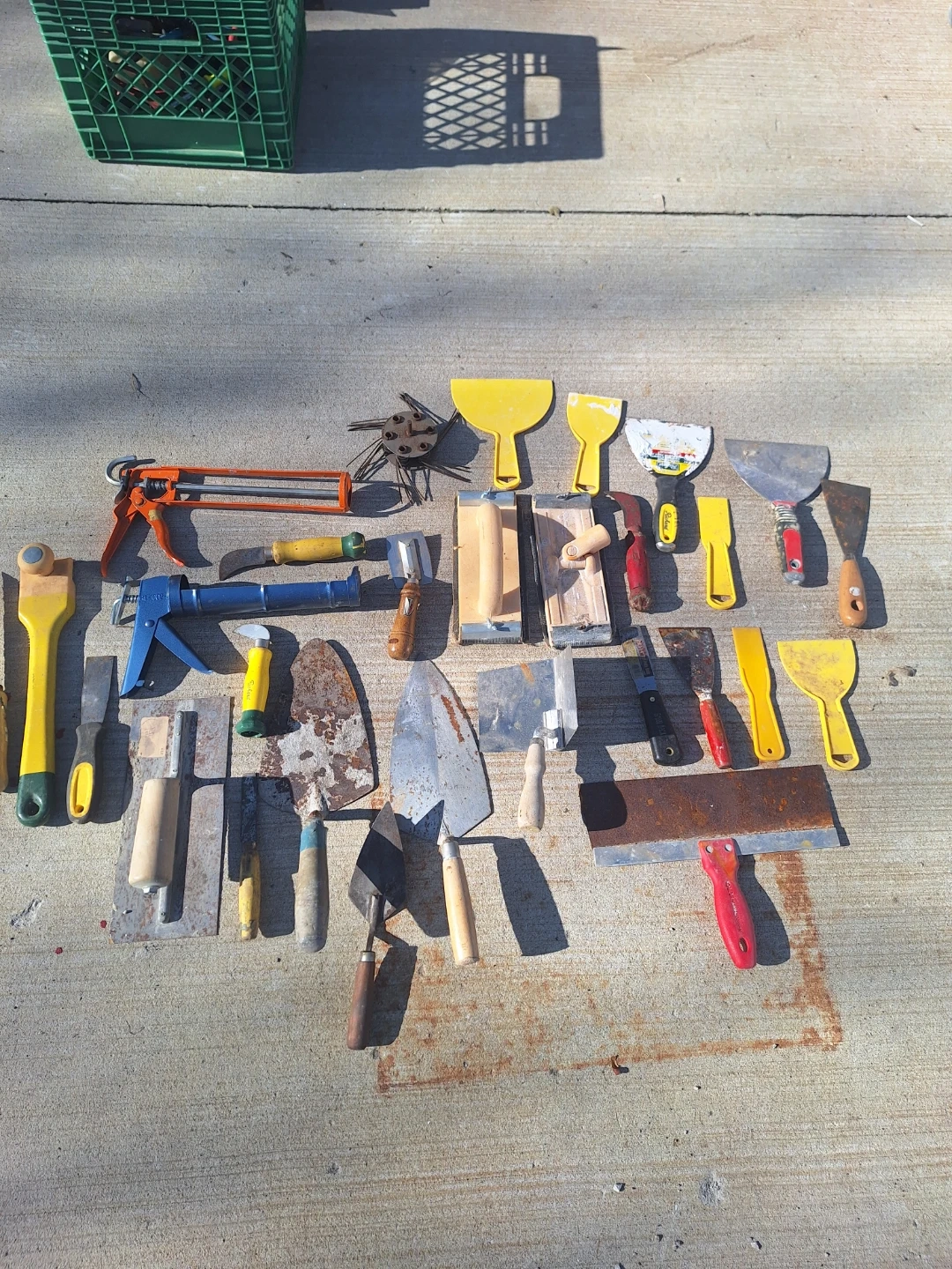 This lot includes a variety of hand tools for patching, scraping, and applying adhesives. You'll find multiple trowels, putty knives, and a caulking gun. These tools are designed for construction and renovation tasks. Painting, Drywall, Caulking.