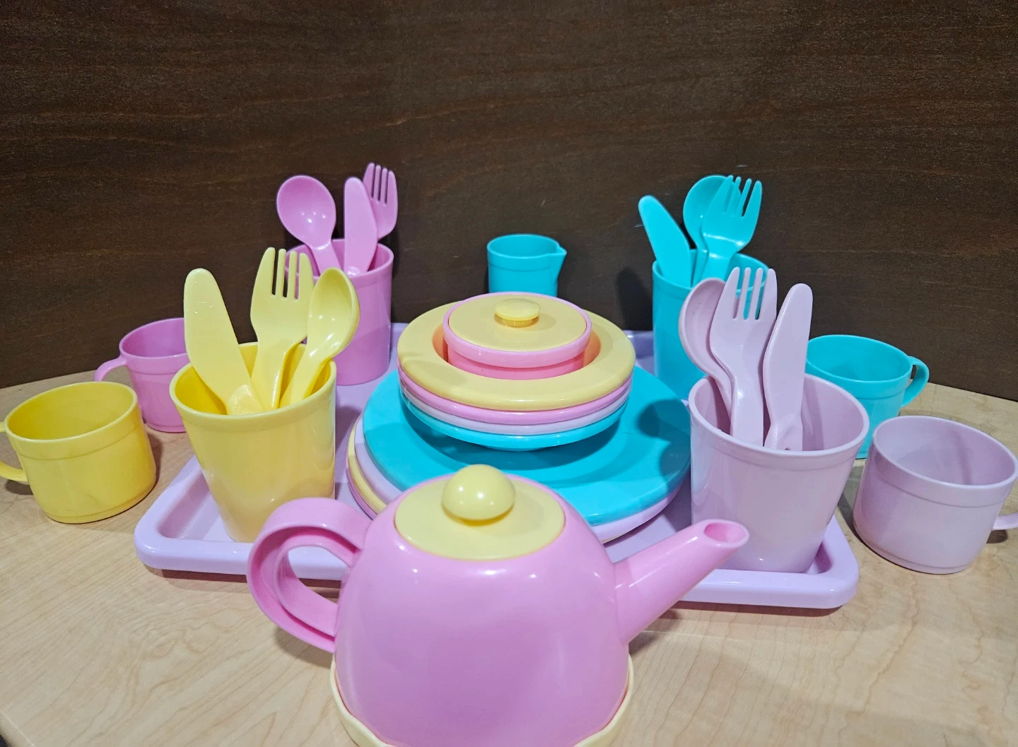This is a colourful plastic toy tea set and dinnerware collection. It includes plates, cups, cutlery, and a teapot. Made from durable plastic, it's perfect for pretend play.