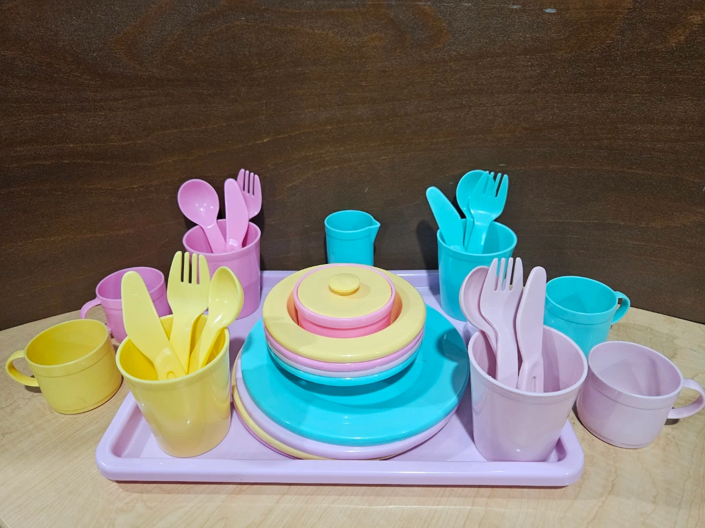 This is a colourful plastic toy tea set and dinnerware collection. It includes plates, cups, cutlery, and a teapot. Made from durable plastic, it's perfect for pretend play.