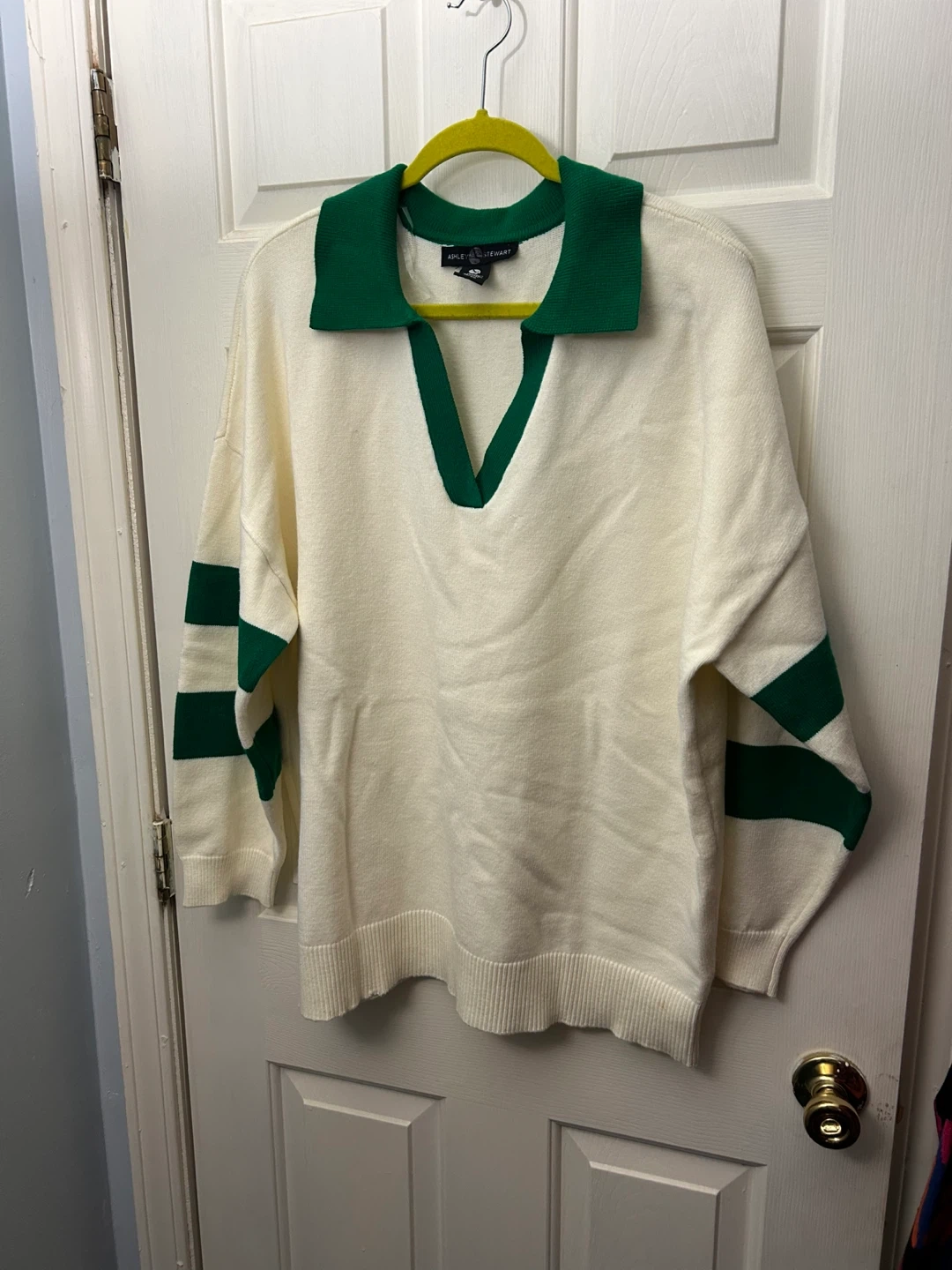 This Ashley Stewart sweater features a cream base with green accents on the collar and sleeves. It has a collared neckline with a V-cut opening. A classic knit design for a stylish layered look!