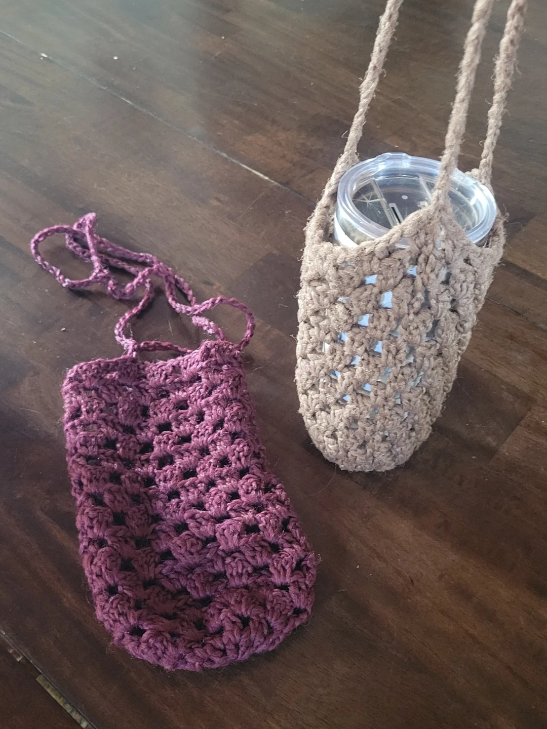 Durable, washable, hand-crocheted bottle holders, available in a variety of colours, including burgundy, light brown, navy, black, light grey . They're designed to carry water bottles or travel cups with a convenient shoulder strap. Made from Phentex for maximum durability.