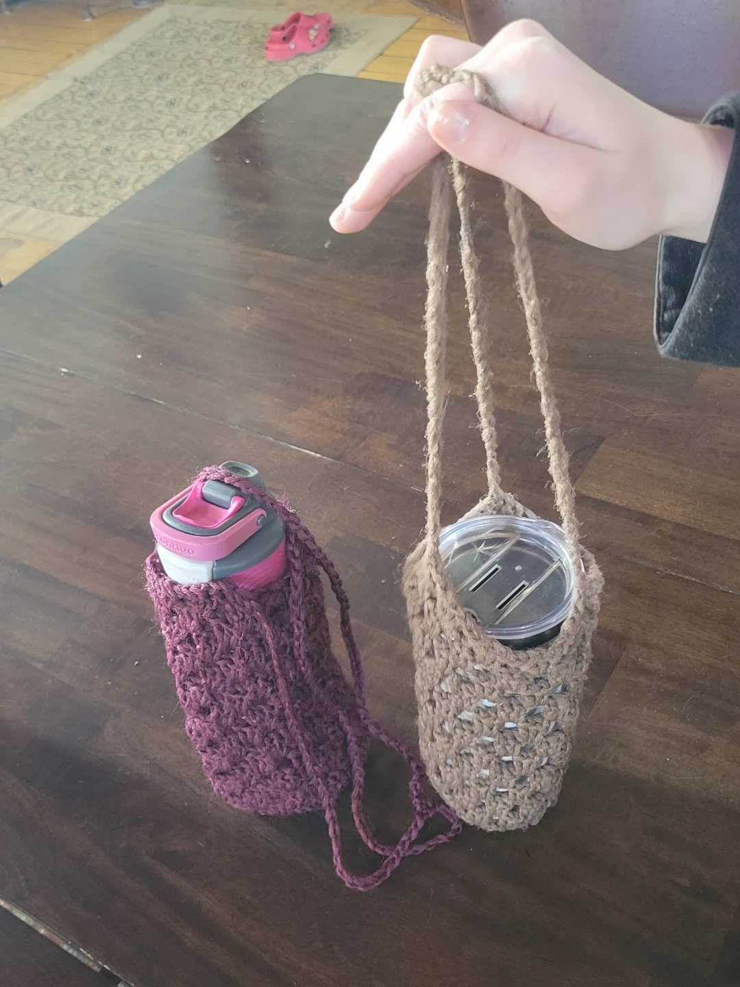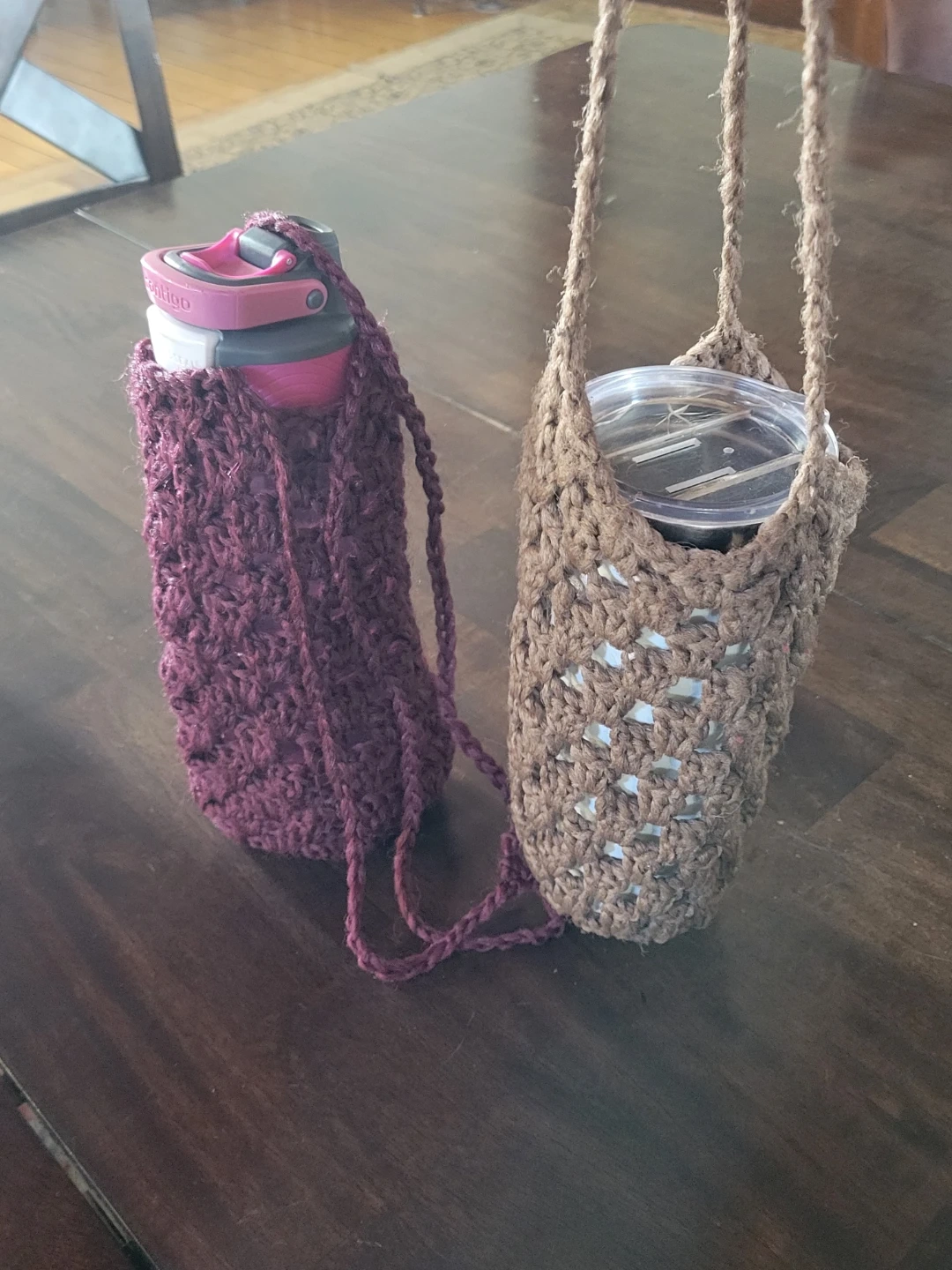Durable, washable, hand-crocheted bottle holders, available in a variety of colours, including burgundy, light brown, navy, black, light grey . They're designed to carry water bottles or travel cups with a convenient shoulder strap. Made from Phentex for maximum durability.