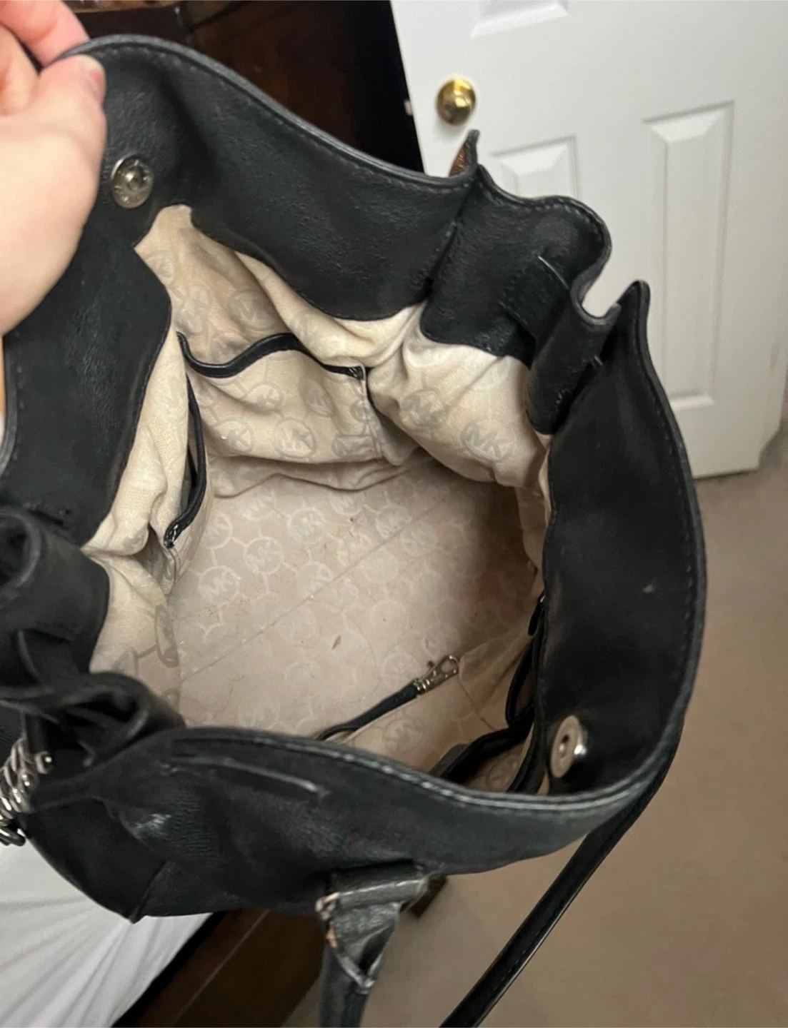This is a black leather handbag from Michael Kors. It features silver-tone hardware and a lock detail on the front. The interior lining has the Michael Kors logo pattern. It's a classic everyday bag with plenty of room inside!