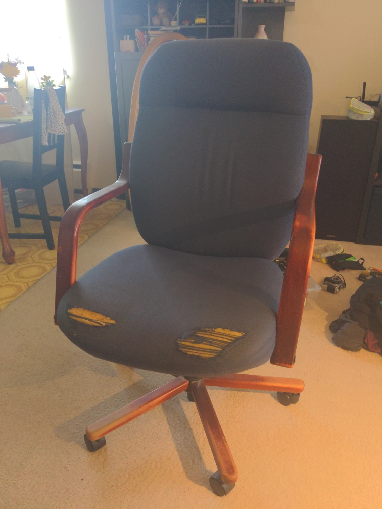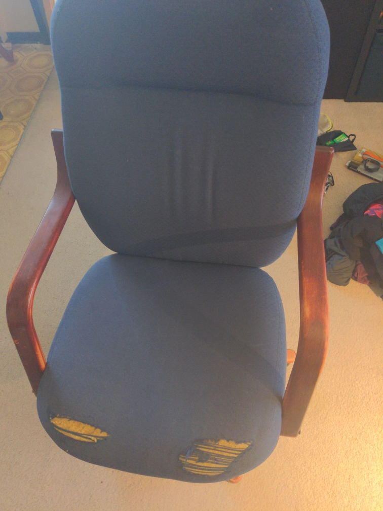 Dark blue fabric office chair. Wooden arms and base. Swivel base with casters. Some fabric tears. Used condition. Free.