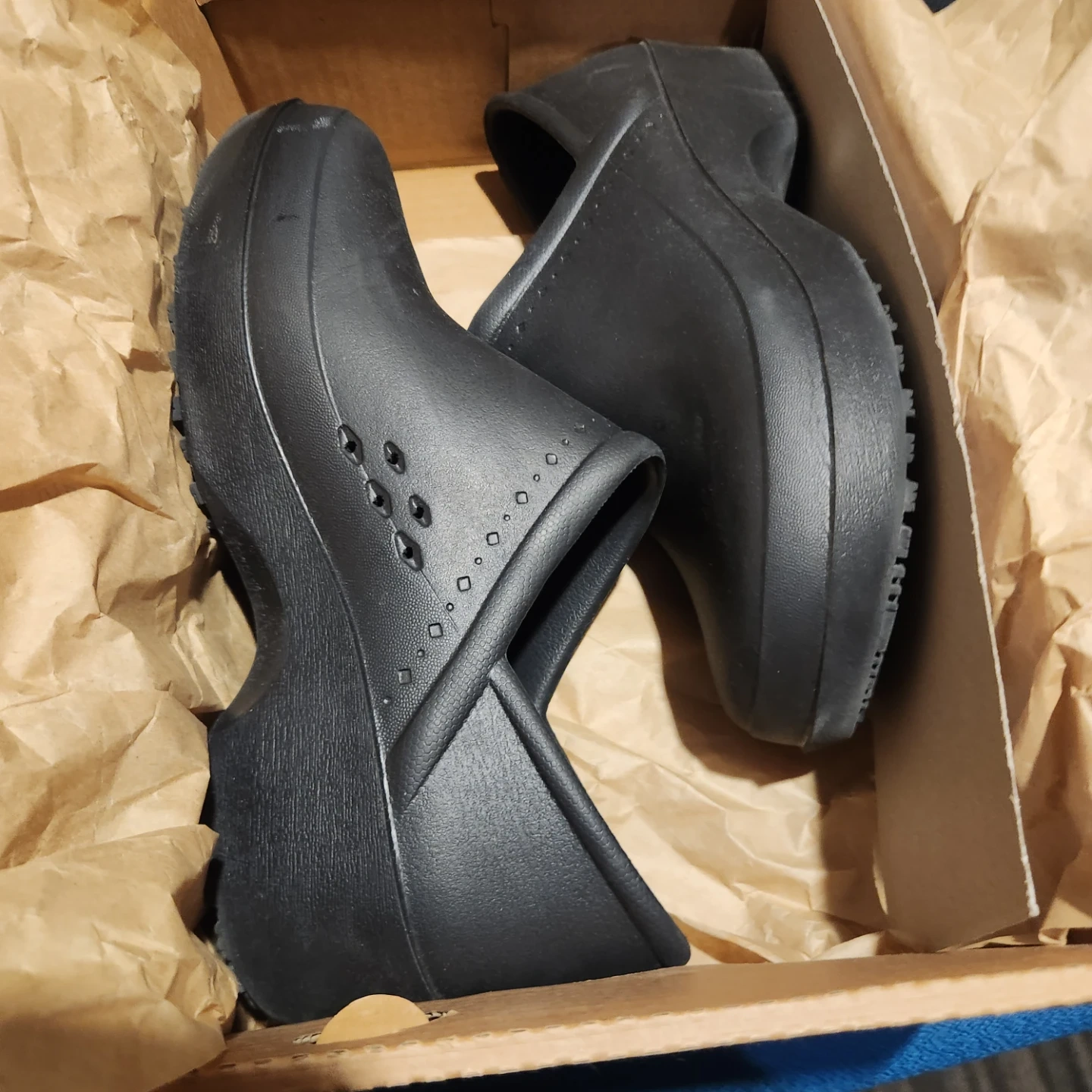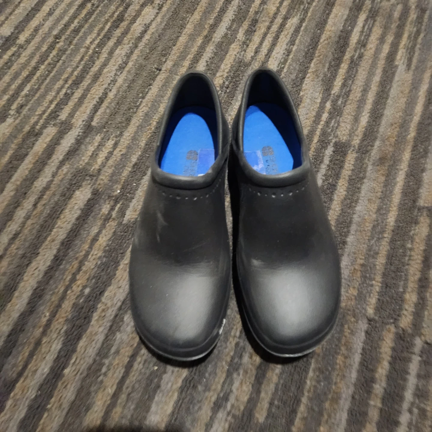 Black slip-on clogs from Shoes For Crews. These shoes come in size 9. I'm a 9.5 or a 10 and they fit well. They are (chefs shoes)for kitchens. They feature slip-resistant soles.