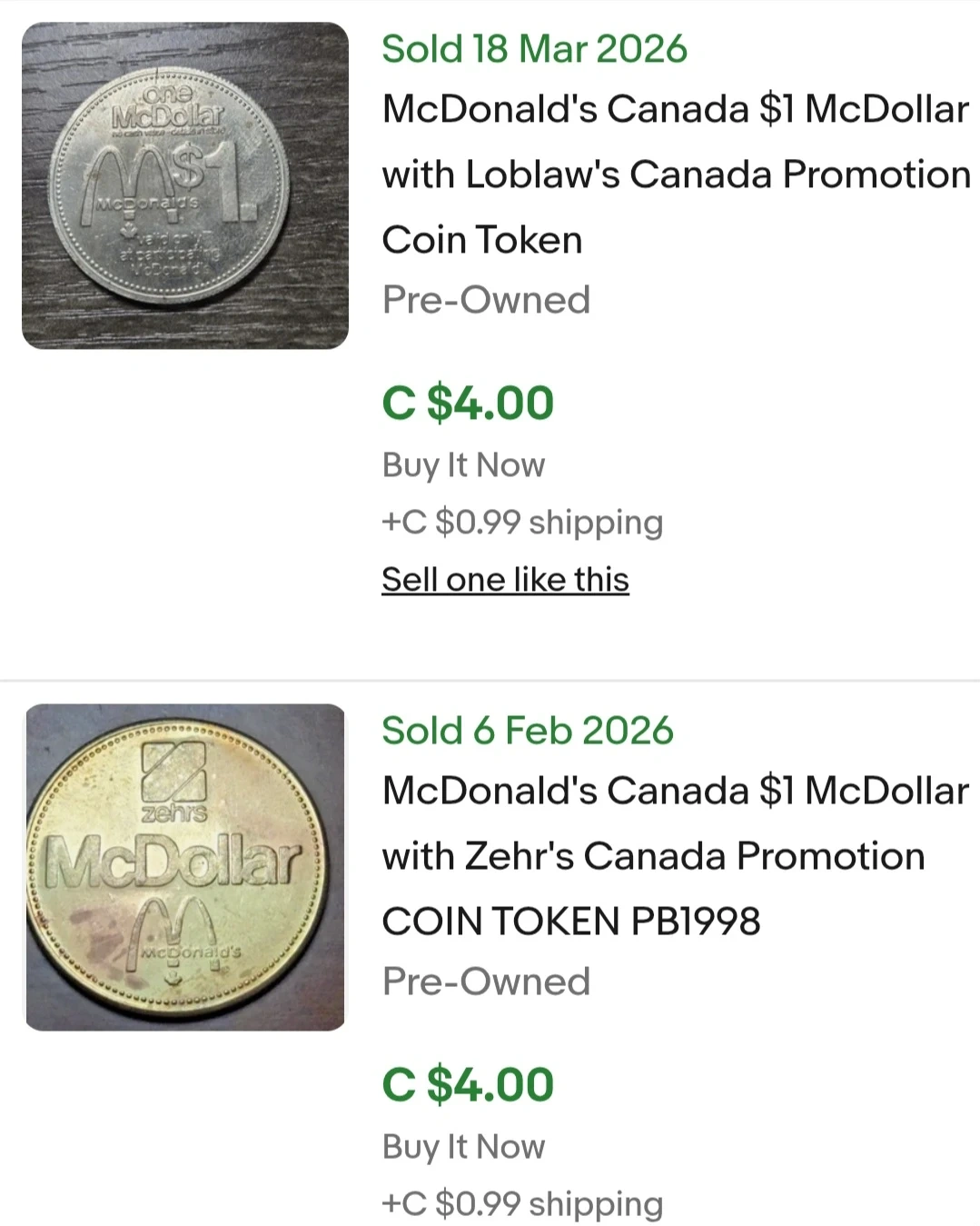 One dollar token from McDonald's Canada, featuring a promotion with Loblaw's and Zehr's.