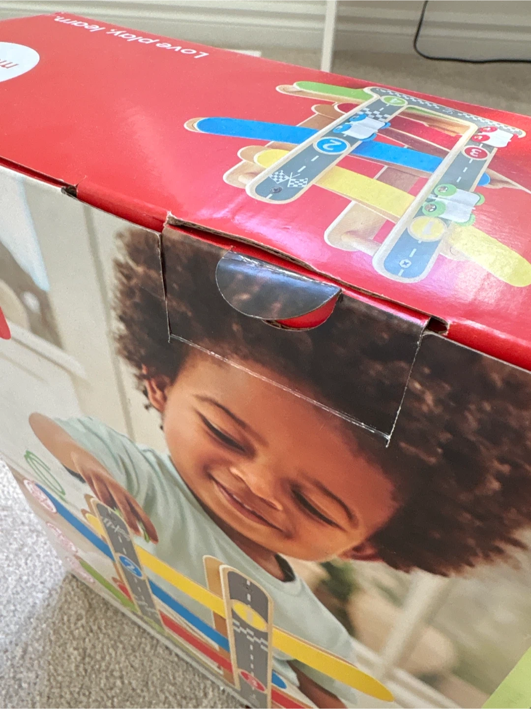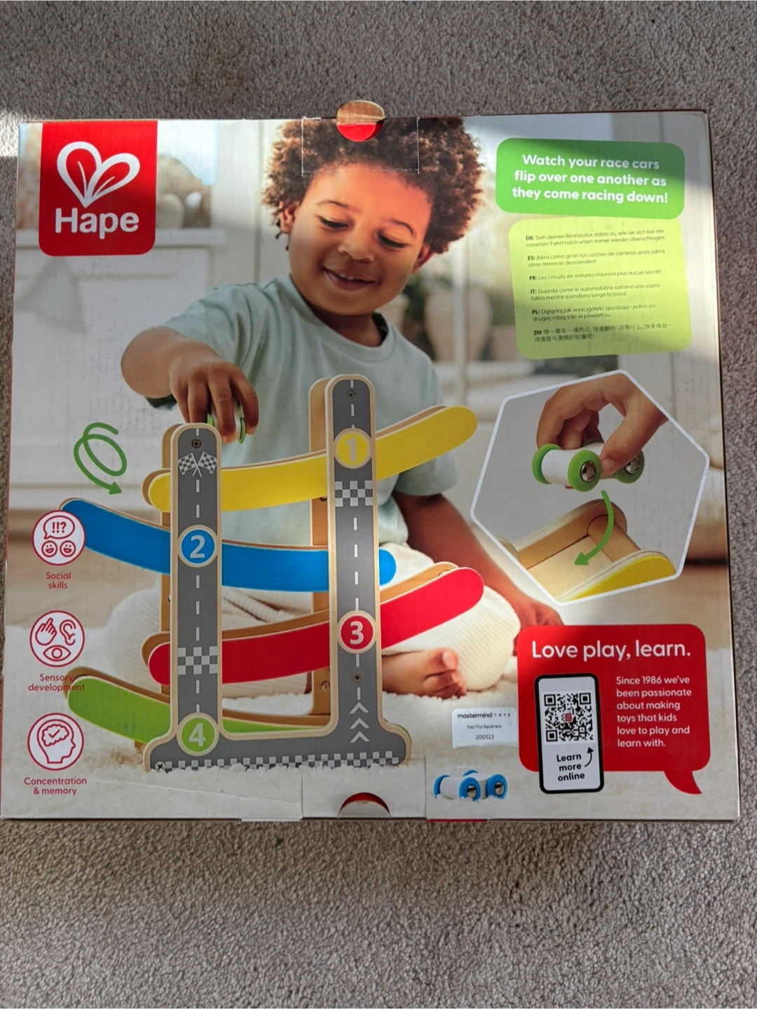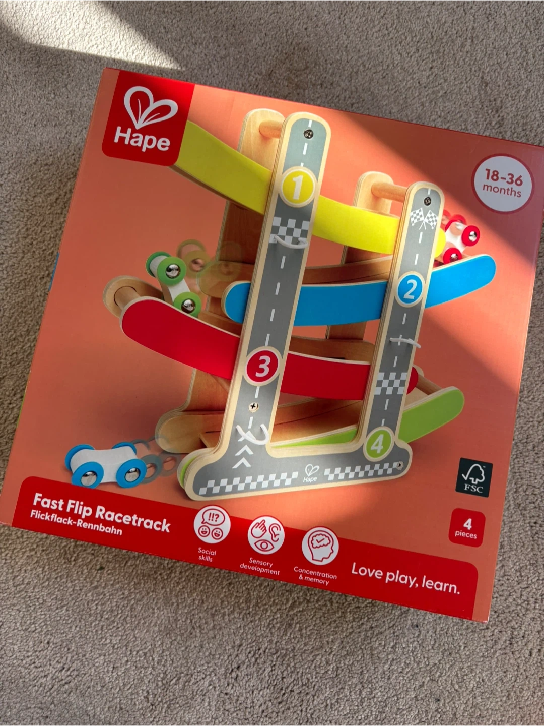 NEVER opened , wood racetrack toy for ages 18-36m.