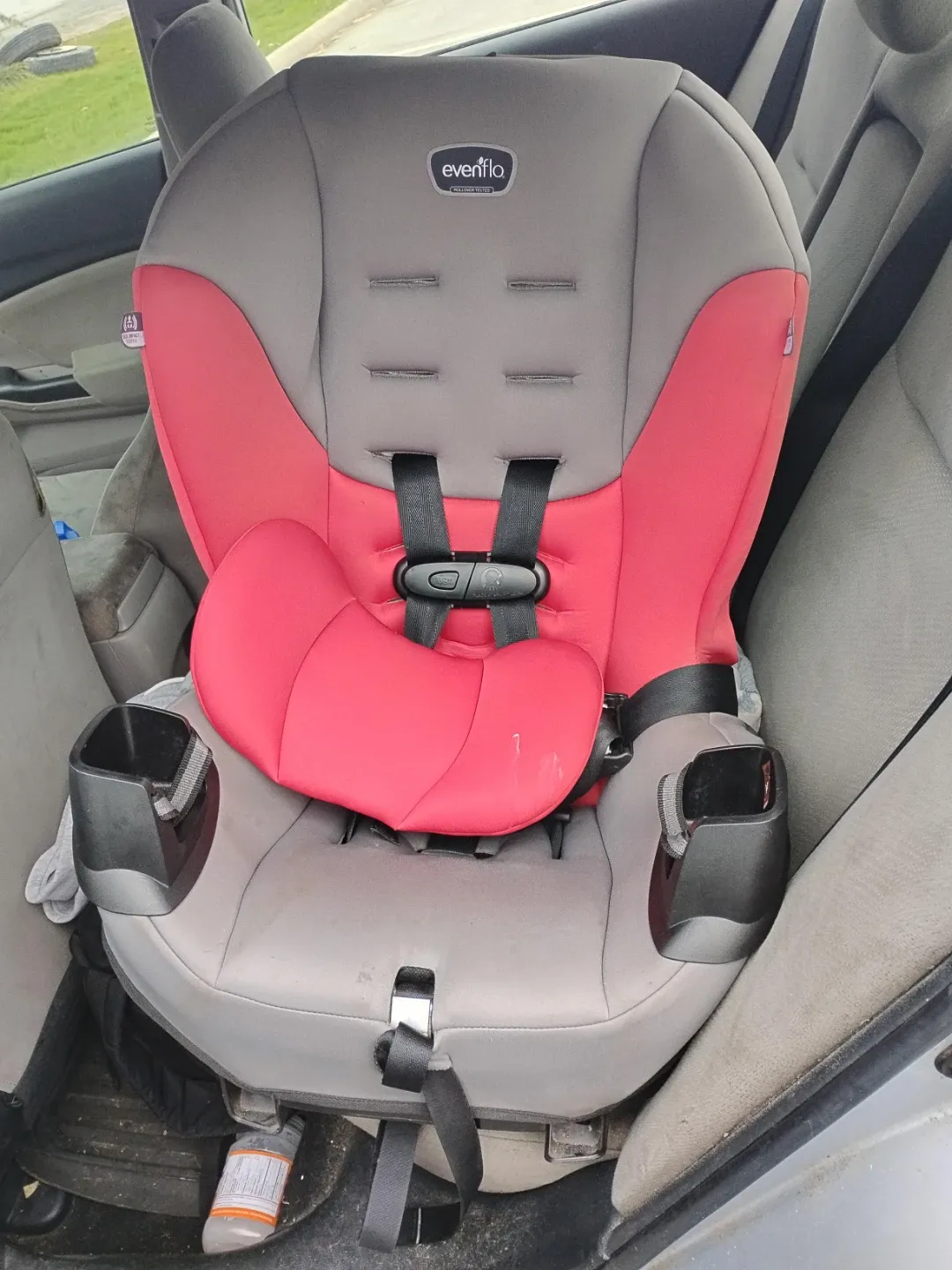 Evenflo car seat in grey and red. It has a 5-point harness system. Cup holders are attached to the sides. This seat is useful for keeping young children safe during travel.