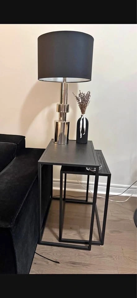 Stylish modern side table with matching lamp. Perfect for a living room, bedroom, or office. The table features a sleek black metal frame with a contemporary nested design, and the lamp has a polished chrome base with a black shade for a clean modern look. Both pieces are in excellent condition and add a very elegant touch to any space. Side Table: $100, Lamp: $60. Take both for $140.