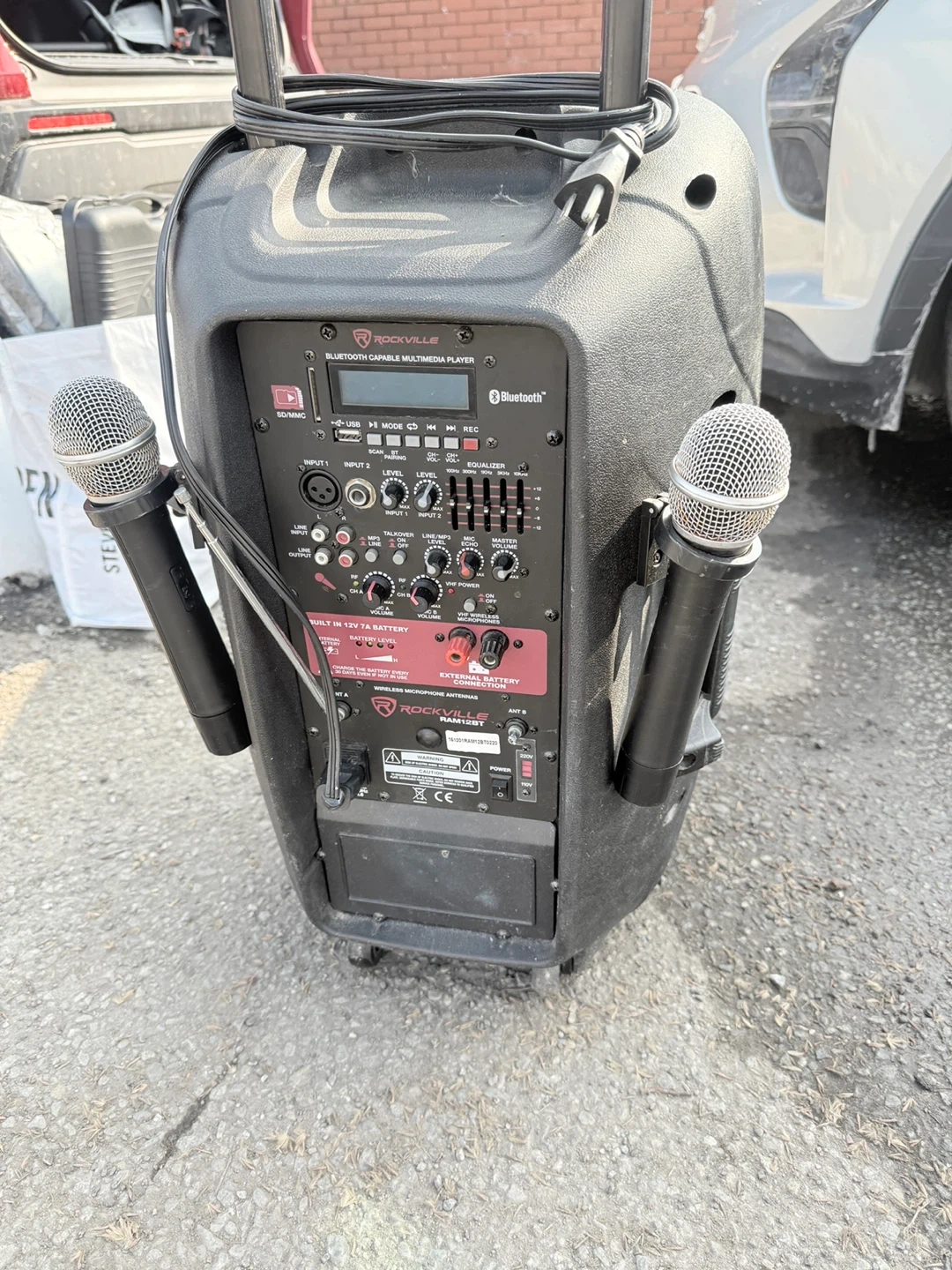 This Rockville PA speaker offers Bluetooth capability and includes two microphones. It's built-in with a 12V 7A battery. Features include multiple input options and an equalizer for sound adjustment.