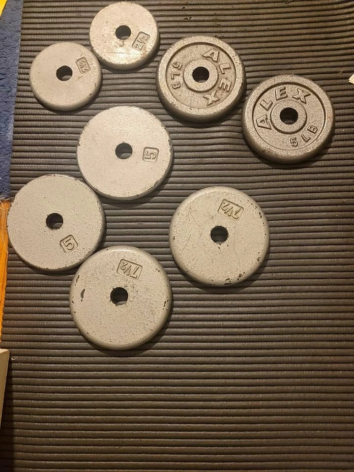 Selling multiple weight plates for dumbbells or barbells: a 2lbs pair, two 5lbs plates, and a 7.5lbs pair. That's 40lbs altogether. Asking $25 for the lot. Feel free to message if you have any questions!