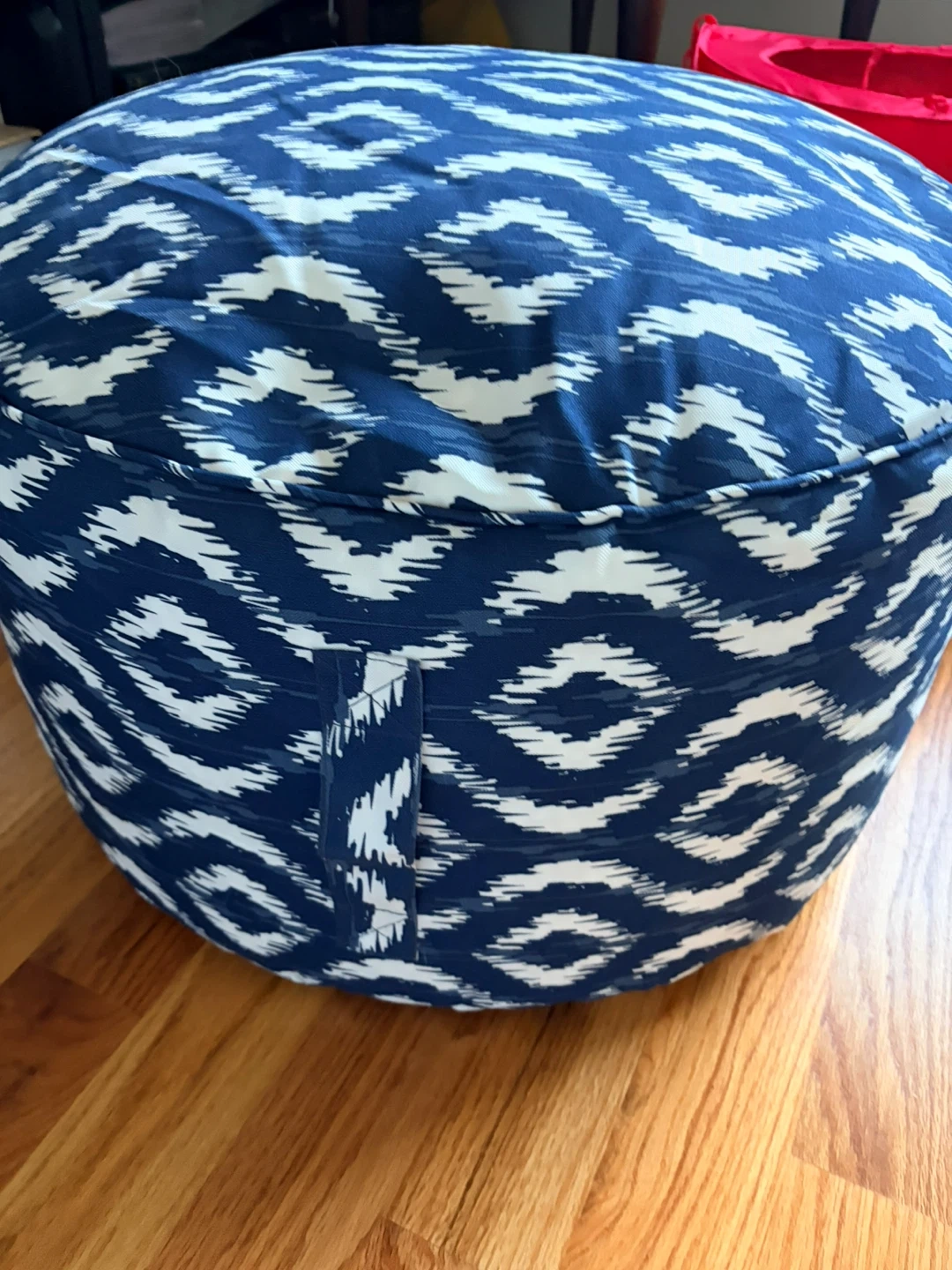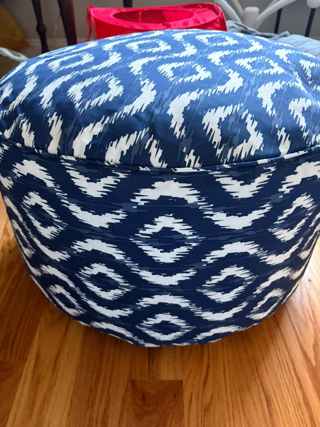 This round pouf ottoman features a blue and white ikat pattern. It's upholstered and filled, offering a comfortable place to rest your feet or as extra seating. It's lightweight and easy to move around your living space.