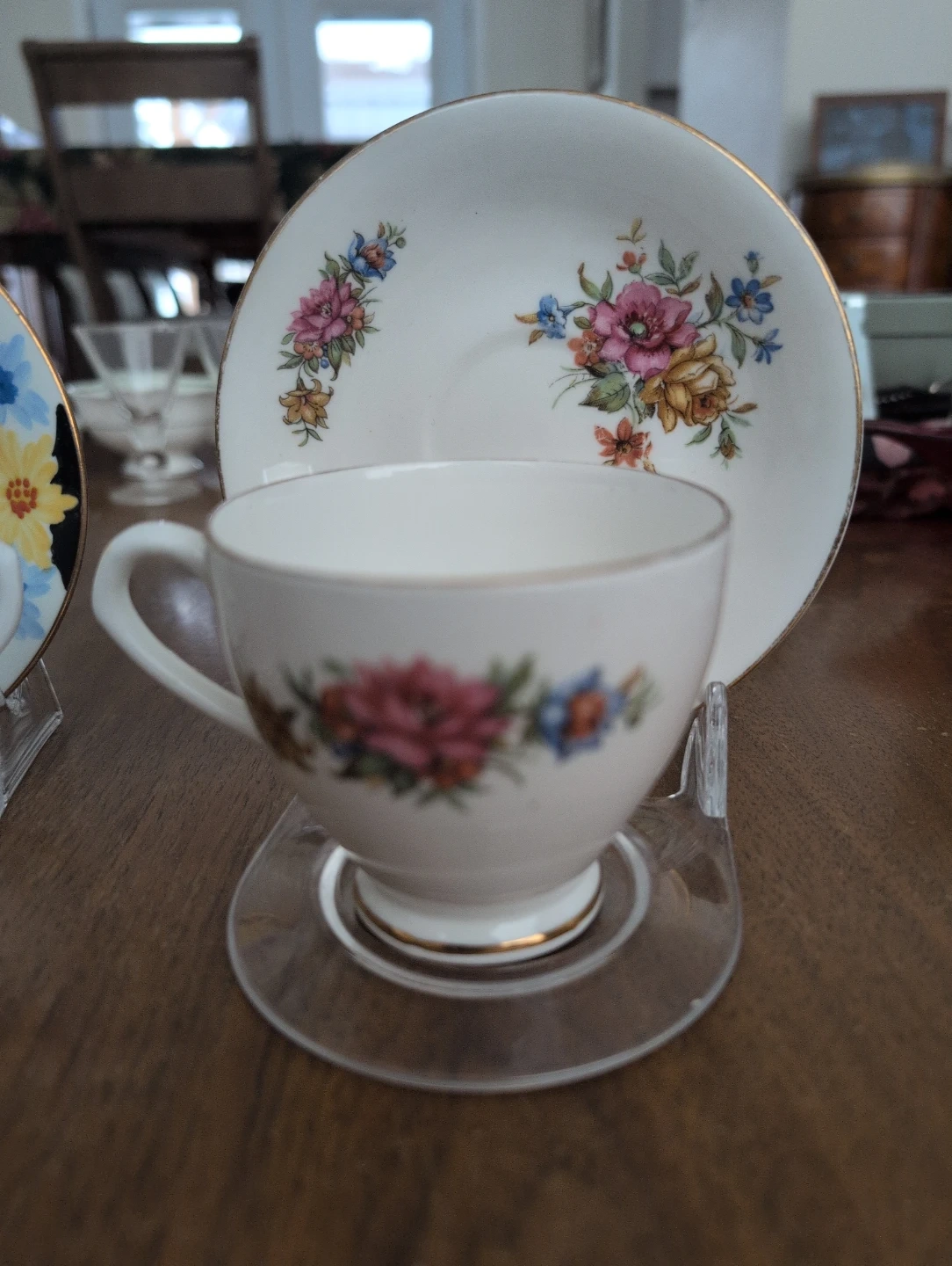 This is a vintage Elizabethan cup and saucer set. It's made of fine bone china and features a delicate floral design. This set would be lovely for enjoying a cup of tea.