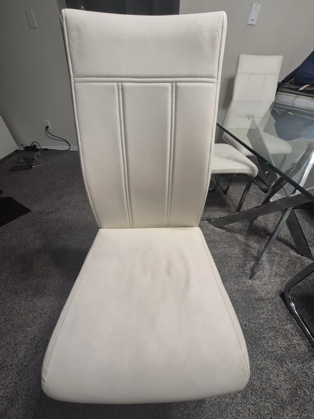 Selling a dining table with a glass top and four white chairs! The chairs have a sleek, modern design with chrome legs and a comfortable seat. It's perfect for a smaller dining space or kitchen nook. The set is in good condition and ready for a new home!