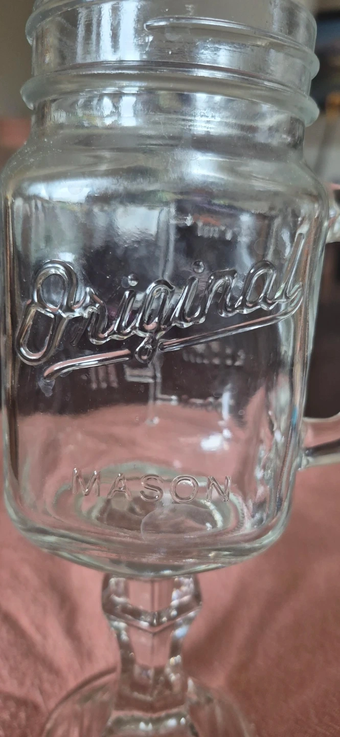 This is an Original Mason jar mug, complete with a handle for easy gripping. It's made of clear glass and has measurement markings on the side. It's a unique way to enjoy your favourite beverages! No chips or cracks. Stem to rim - 9 inches tall. Solid Mugs. These mugs are also call redneck wine mugs or what ever your poison. I have 3 of them at $15.00 each.