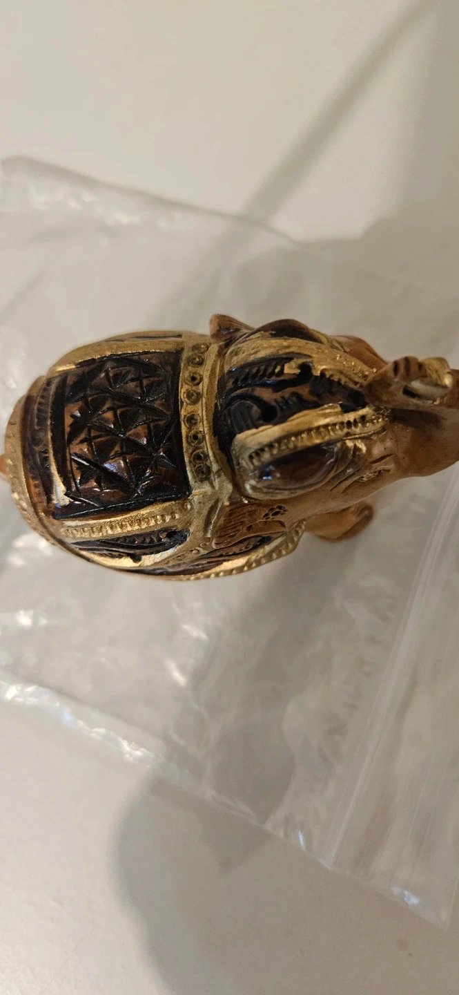Small size! This is a decorative figurine of an elephant. It features intricate carvings and gold-tone accents. It would make a lovely decorative piece for a shelf or table.