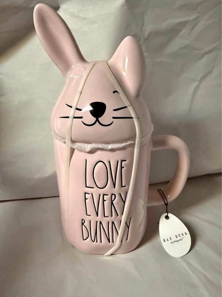 RAE DUNN Mug ~ NEW! Great gift idea this holiday 🐰 Dishwasher safe - may get hot in microwave. LOVE EVERY BUNNY ~ pink bunny topper. Porch pick-up in Oshawa (Rossland & Wilson). Items are only held with payment. Quick pick-up preferred (same or next day). Listing up = still available! EMT preferred. Cash accepted. Friendly & highly rated seller. Browse my other listings for more great finds.