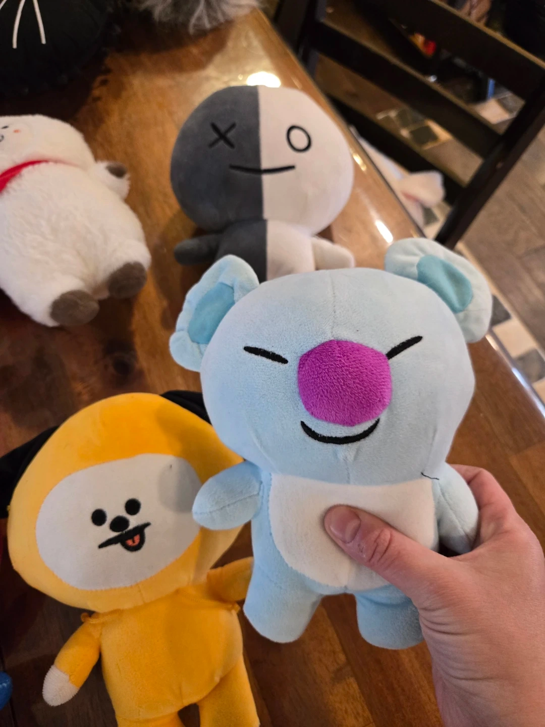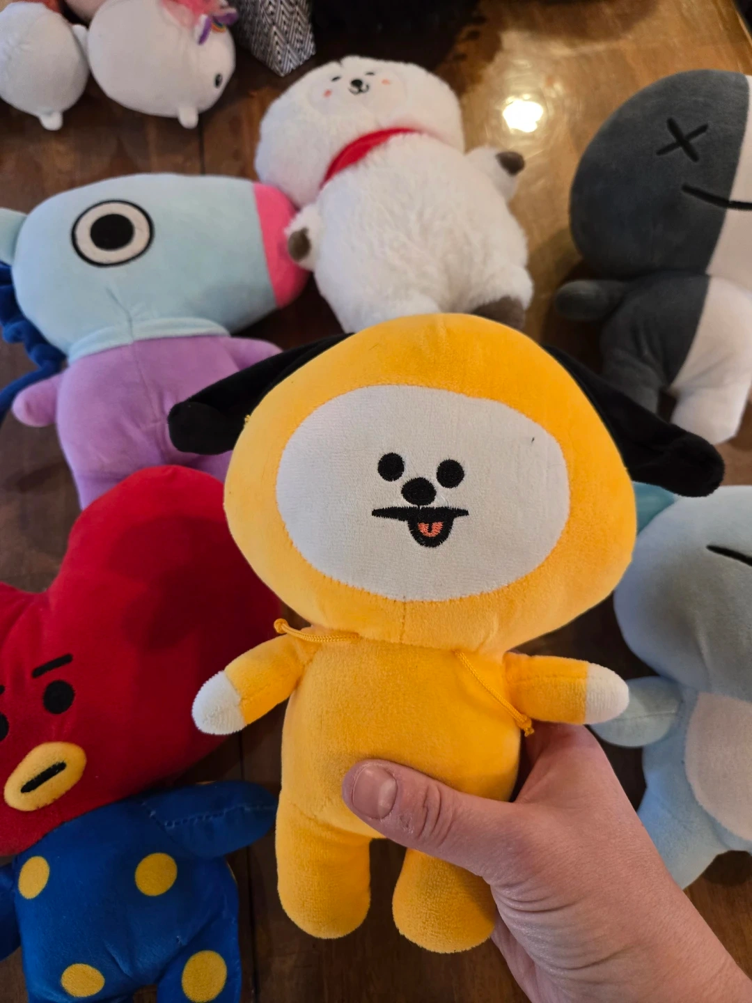 A collection of six BT21 character plush toys. Includes Tata, Chimmy, RJ, Cooky, Shooky, and Mang. Soft and cuddly plush material. These characters are from the popular K-pop group BTS. 45 for all