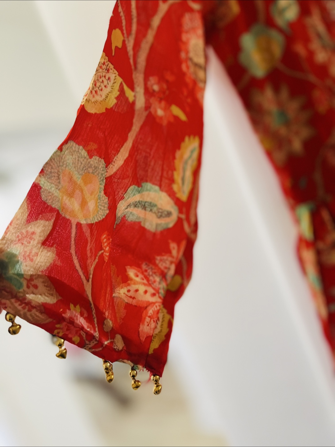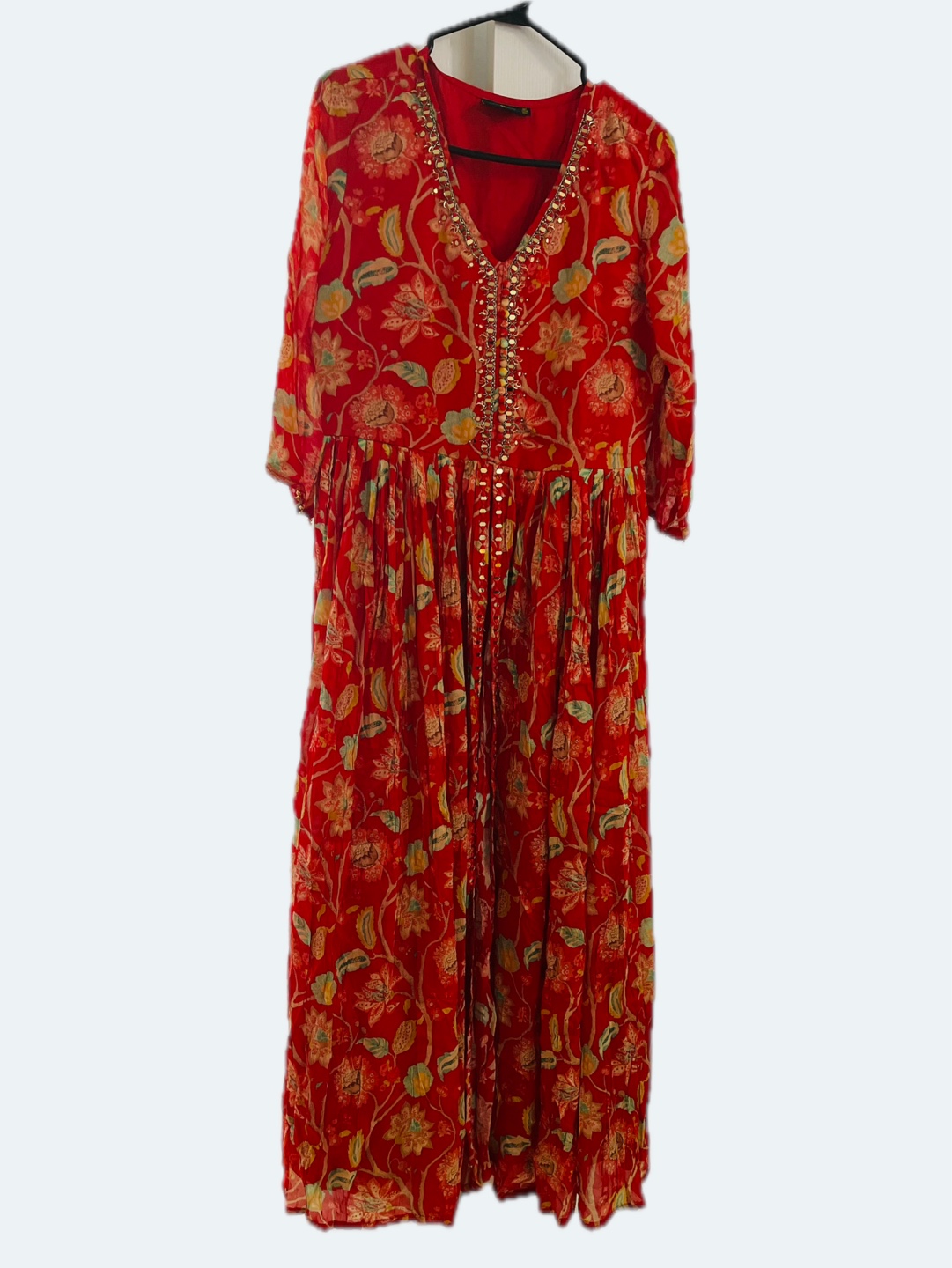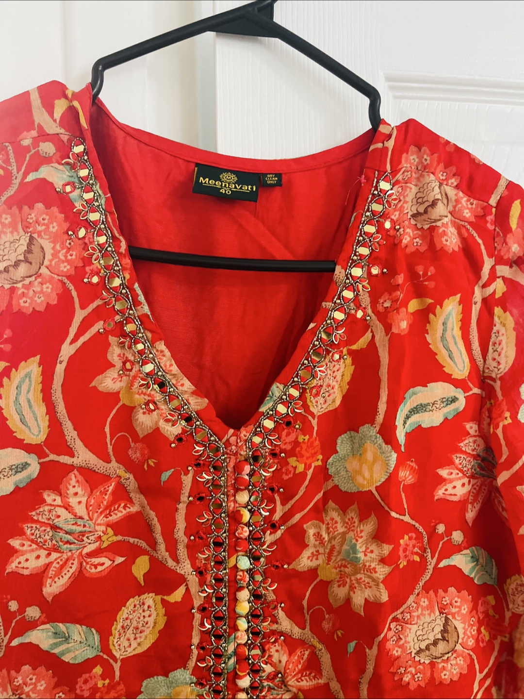 Selling a beautiful Meena Bazaar dress in a vibrant red floral print! The dress is a size 40. It features lovely detailing around the neckline. Perfect for a special occasion or to add a pop of colour to your wardrobe!