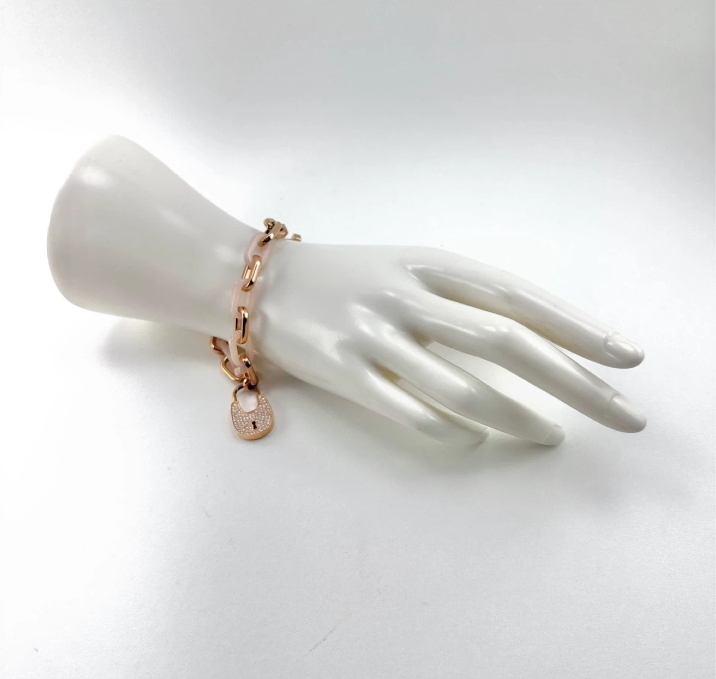 Ladies rose gold finish Micahel Kors pink link bracelet with heart locket, measuring 8” long overall, in excellent condition