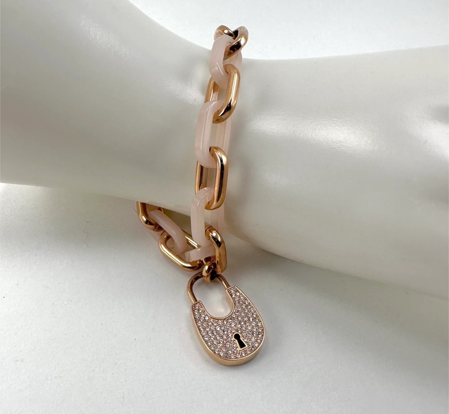 Ladies rose gold finish Micahel Kors pink link bracelet with heart locket, measuring 8” long overall, in excellent condition