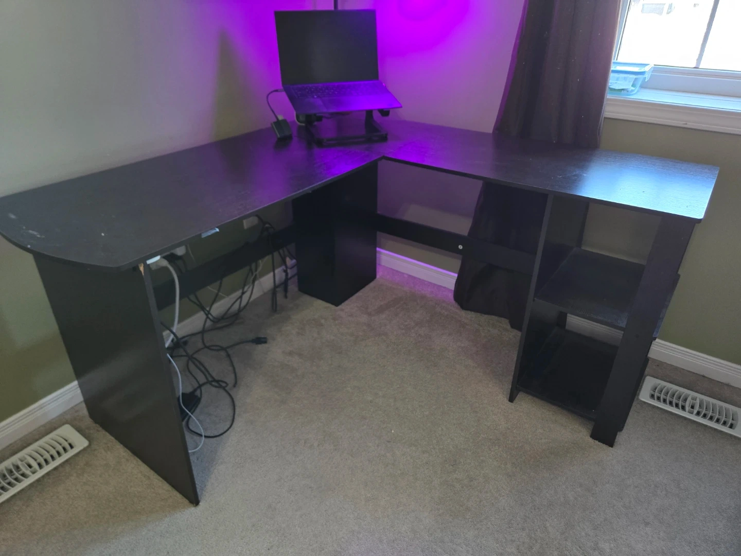 This black L-shaped desk provides ample workspace and fits neatly into a corner. It has a smooth surface and open shelving on one side for storage. It's ideal for setting up a home office or gaming station. Its detachable.