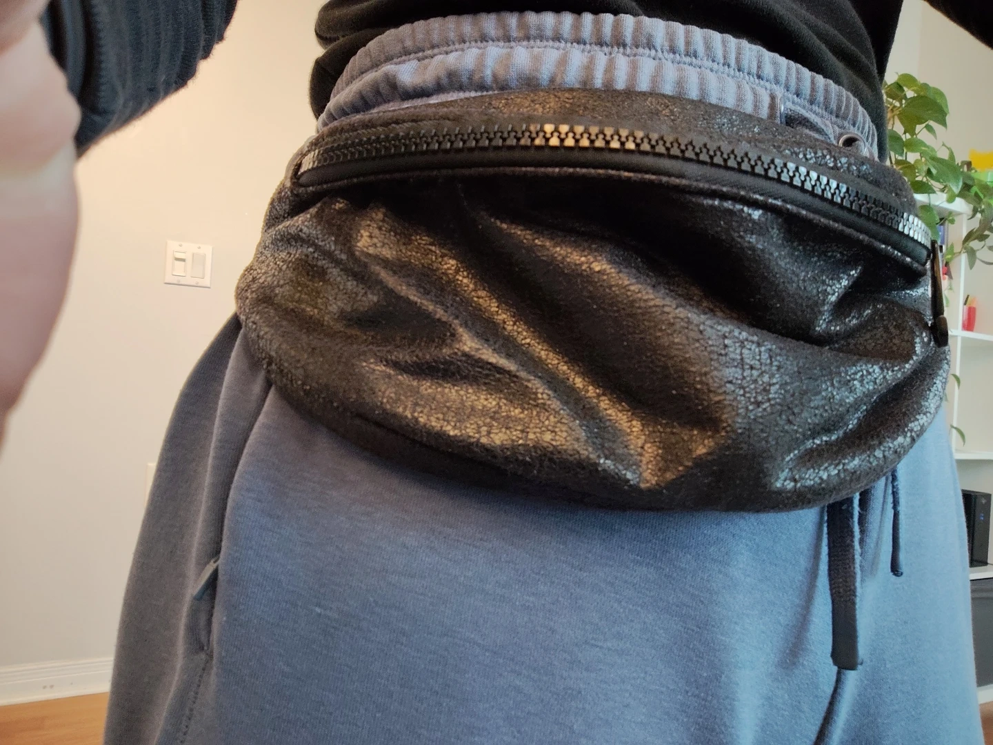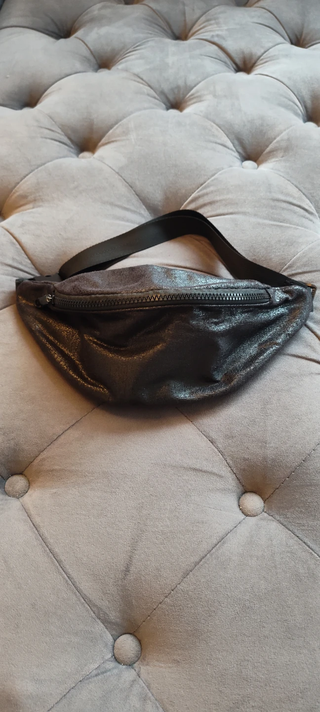 This black fanny pack is made of textured faux leather. It has a zippered main compartment and an adjustable strap. It's great for keeping your essentials handy while on the go!