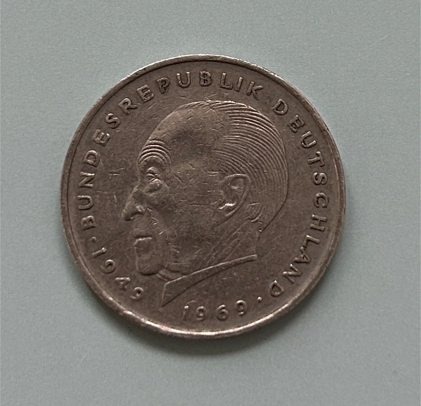 This is a 2 Deutsche Mark coin from Germany, minted in 1973. It features the Bundesrepublik Deutschland emblem on one side and a portrait on the other. A nice addition for collectors!
