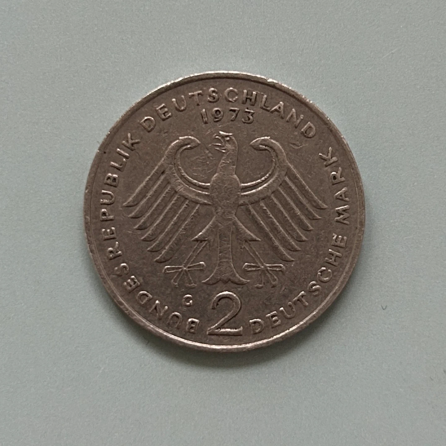 This is a 2 Deutsche Mark coin from Germany, minted in 1973. It features the Bundesrepublik Deutschland emblem on one side and a portrait on the other. A nice addition for collectors!