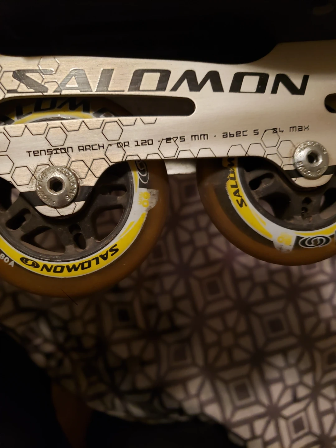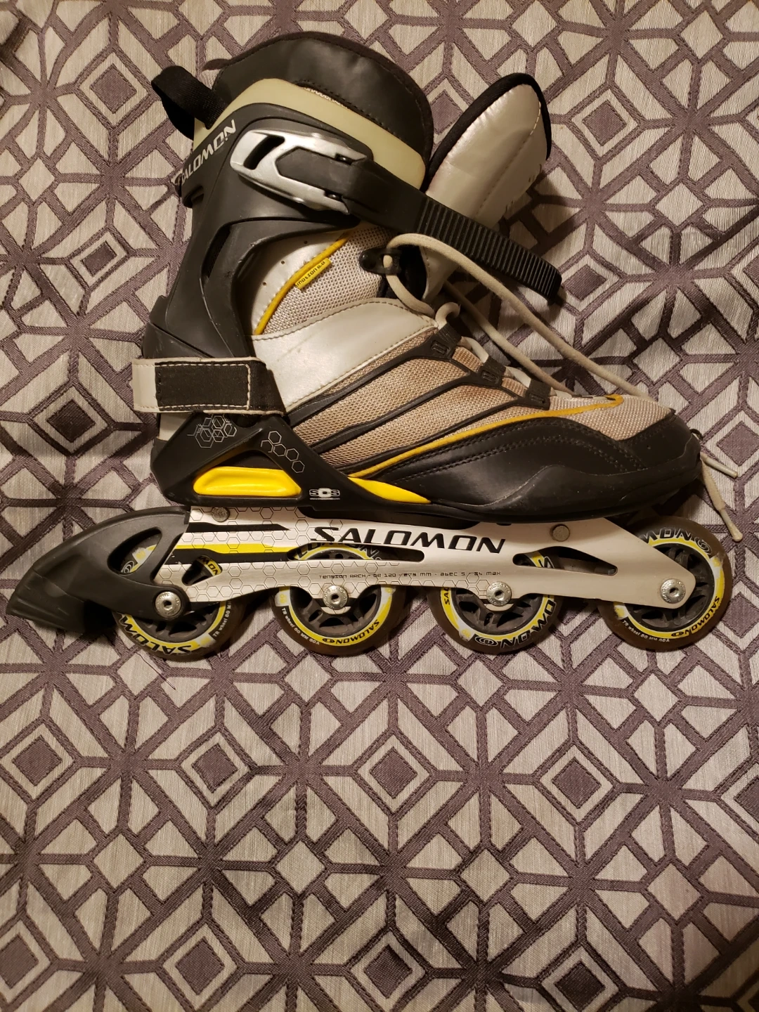 These Salomon inline skates are in a men's size 42 2/3 (UK 8.5, US 9). They feature a 295 mm frame with 120 mm wheels. The Salomon cushioning system is integrated for comfort. Great for recreational skating!