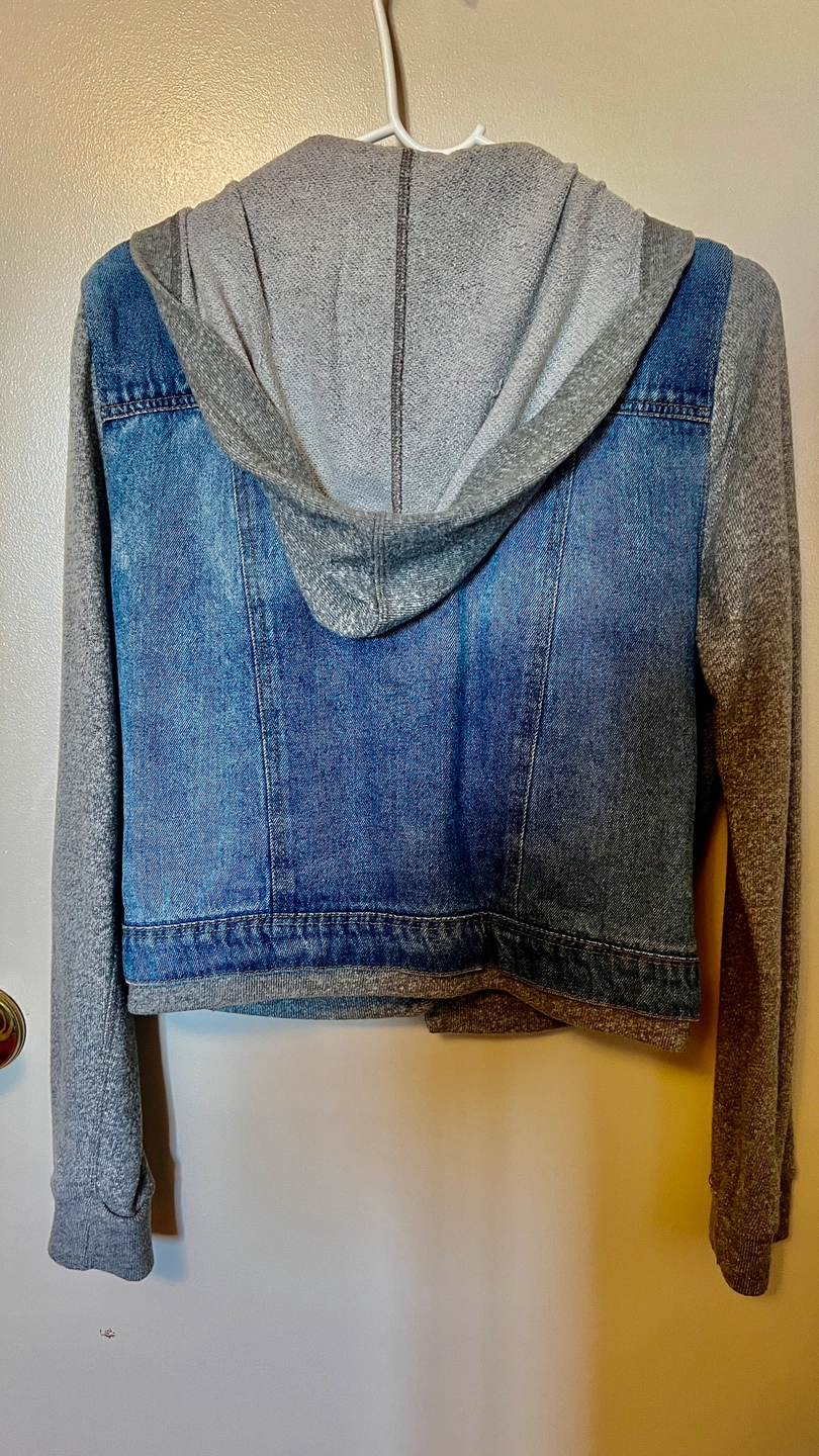 A denim jacket with grey hoodie and sleeves. The jacket has a button-up front closure. The sleeves are grey, but the rest of the jacket is denim. It has two pockets on the front. The back is a plain denim design.