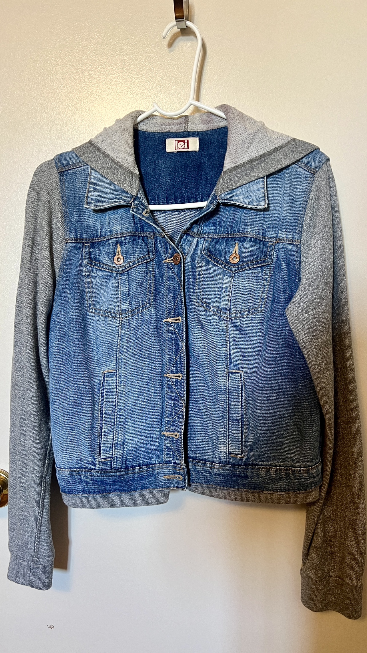 A denim jacket with grey hoodie and sleeves. The jacket has a button-up front closure. The sleeves are grey, but the rest of the jacket is denim. It has two pockets on the front. The back is a plain denim design.