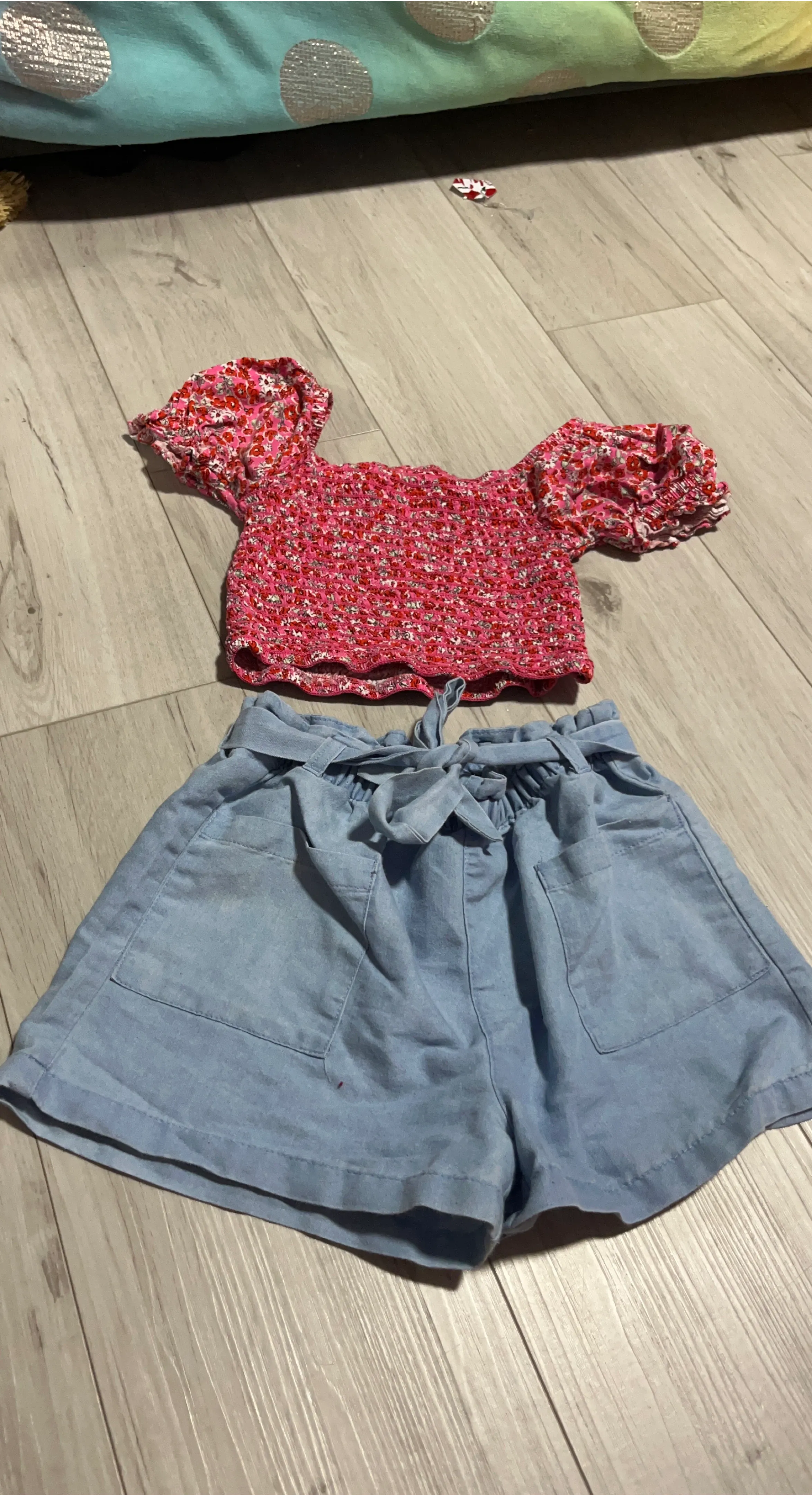 Cute girls' outfit featuring a floral print top and denim-look shorts with a tie waist detail. Perfect for summer!